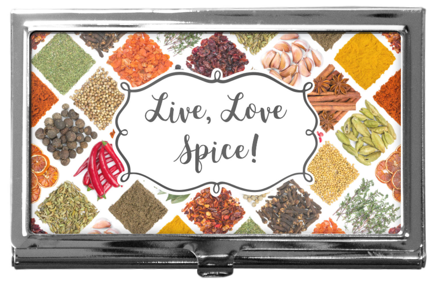 The words "Live, Love, Spice" are featured in a curly frame in the middle of this design. You can easily customize the words to your liking. We have other herb & spice patterns in our library - so feel free to browse and use the pattern that appeals to you. Let us know if there is anything that we can help you with.