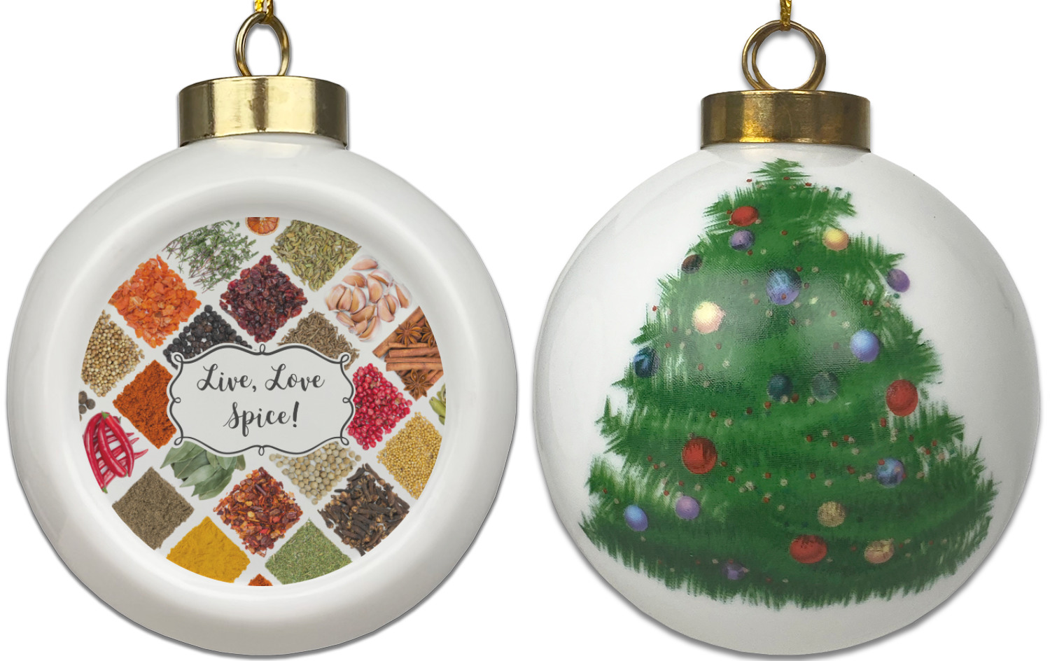 Our Christmas ornaments are a unique ceramic ball shape with a twist as it has a flat face to display your custom design! Select from one of our two design types - Christmas Tree or Poinsettia Garland - to adorn the curved back of your personal design. Each ornament measures 3H x 2.5W x 2D accompanied with a gold string accent for finishing touches to hang on your beautiful Christmas tree!