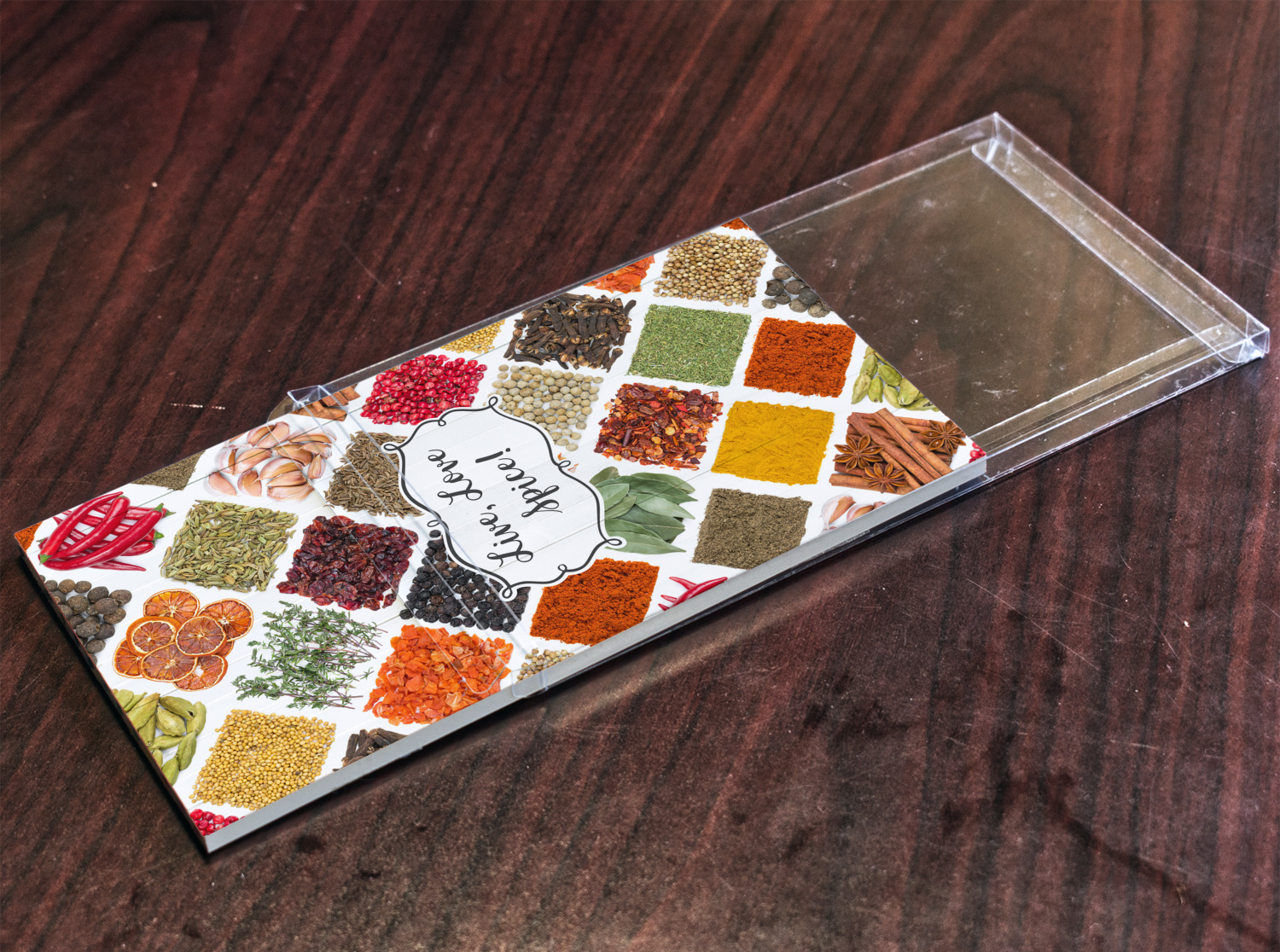 The main pattern is made of various spices such as dried thyme, white pepper, coriander, cumin, turmeric, red chili peppers and a whole lot more. The spices are all laid out in a fun diamond repeating pattern. This design simply looks stunning on any cook wear and more.