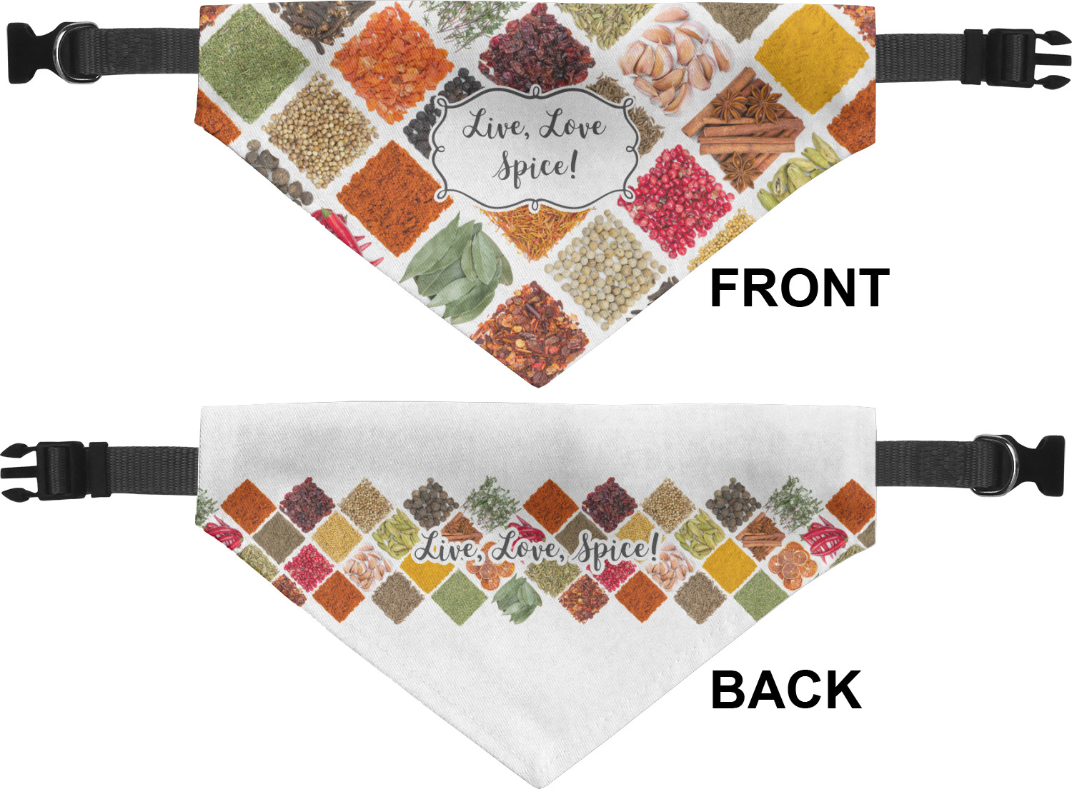 We print the front and back of these dog bandanas with your customized design. The bandana itself is made from a durable polyester, sewn together with a gap large enough to accommodate any collar. Regardless, the bandana includes a plain black, canvas collar with plastic snaps, that can easily be removed if desired. These dog bandana collars are available in four sizes: small, medium, large, and extra large. Please see our sizing chart for more information regarding the dimensions of each size.