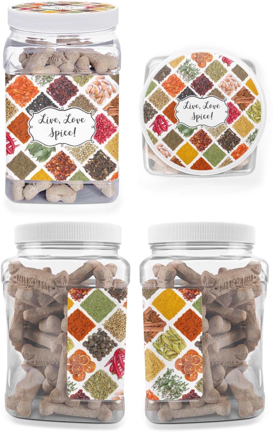 This half gallon jar, made from a sturdy plastic, is the perfect way to keep treats from any naughty pet paws, while still keeping them ready on hand for when your pup performs an impressive trick. This dog cookie jar features a screw-on, white lid that displays your personalized design on a vinyl sticker. We apply another customized sticker that wraps around the front and sides of the jar. Our dog treat jar also has indentations on the rear ends of the sides, which allows for convenient handling, and its square frame allows for easy storage.