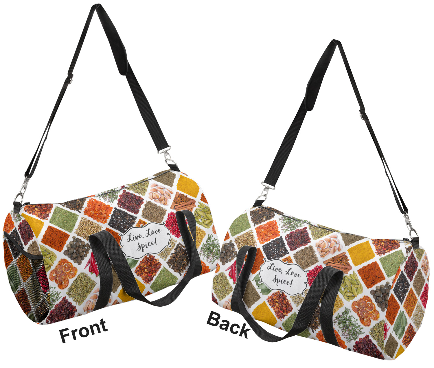 This duffle is a sturdy bag made of a canvas material. It comes in two sizes: Small (19"W x 9.5"H x 9.5"D) and Large (23"W x 12"H x 12"D). The bag is a cylindrical shape with a black adjustable strap and two handles. On one side is an elastic pouch to put a waterbottle or other small item. Your product will be sublimated with your design and is able to be designed on the front, back, and sides. Be sure to remember that the straps may cut into parts of your design if you upload your own artwork.