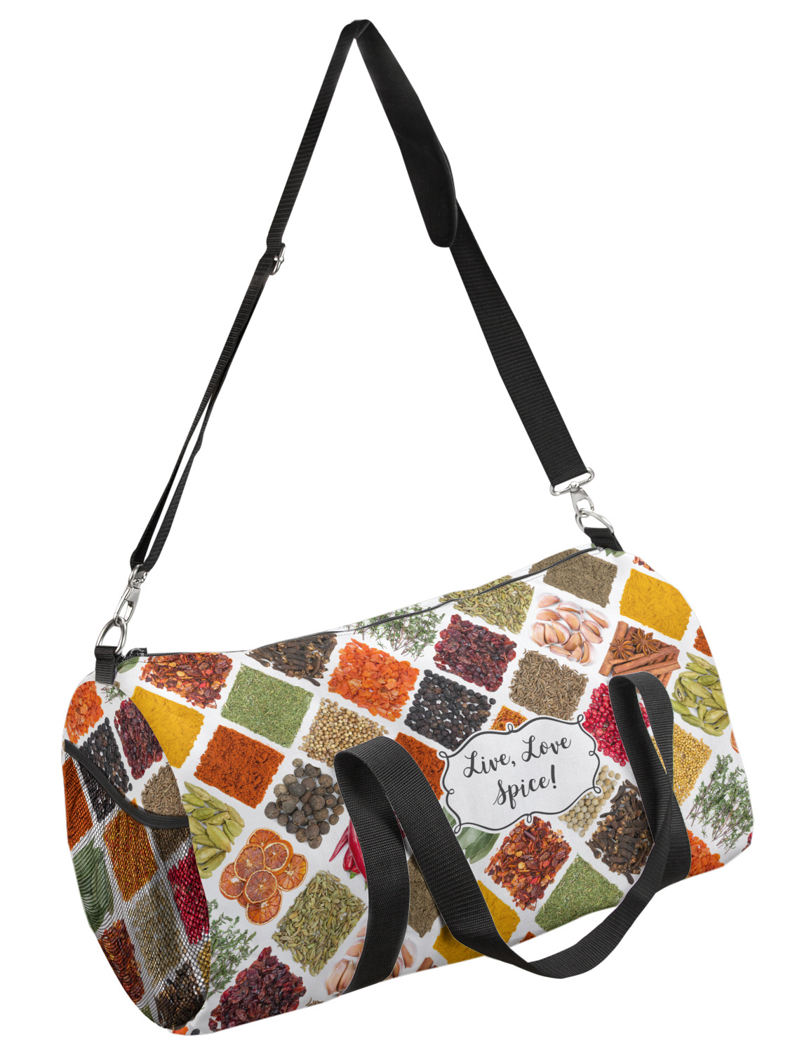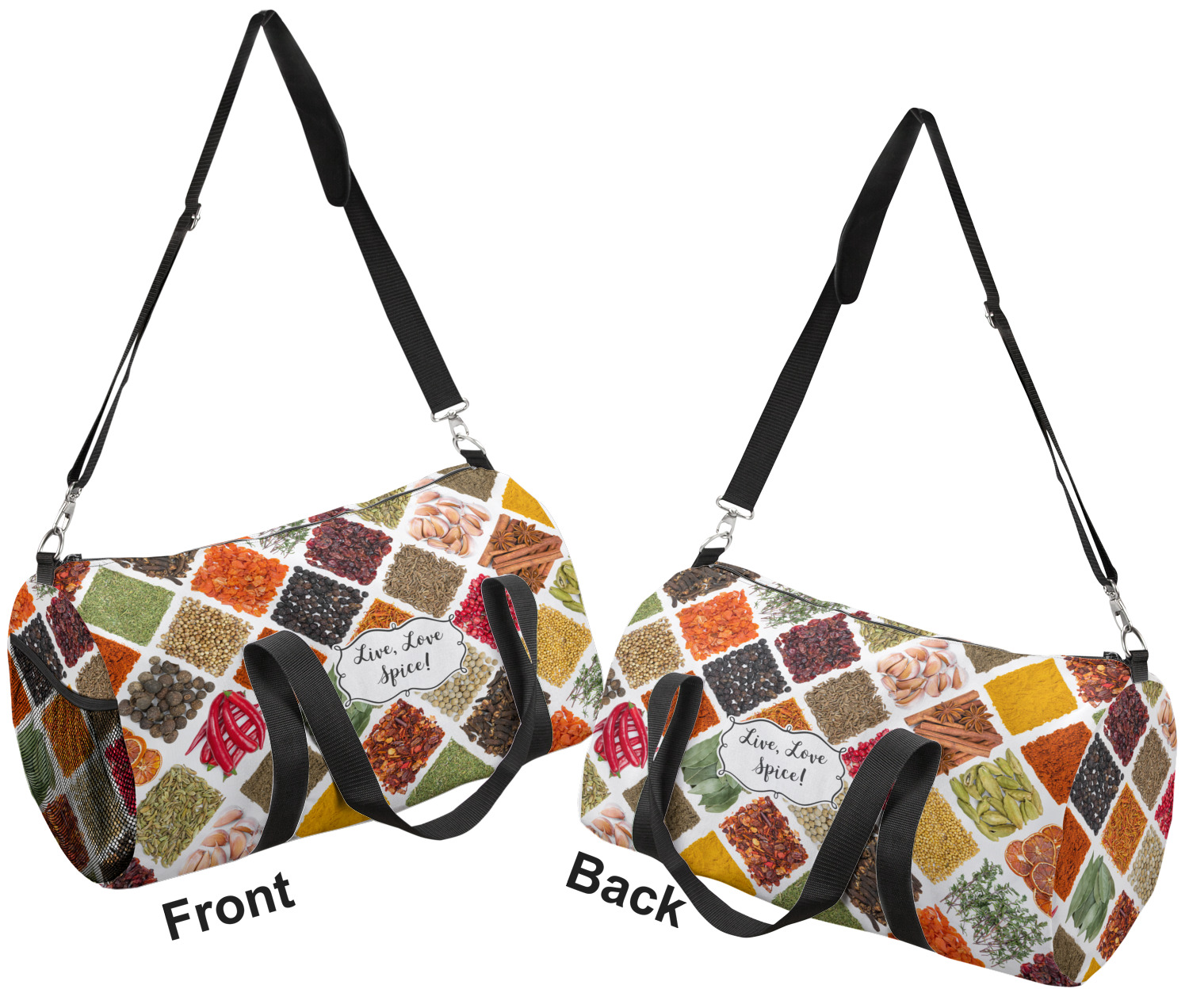 This duffle is a sturdy bag made of a canvas material. It comes in two sizes: Small (19"W x 9.5"H x 9.5"D) and Large (23"W x 12"H x 12"D). The bag is a cylindrical shape with a black adjustable strap and two handles. On one side is an elastic pouch to put a waterbottle or other small item. Your product will be sublimated with your design and is able to be designed on the front, back, and sides. Be sure to remember that the straps may cut into parts of your design if you upload your own artwork.