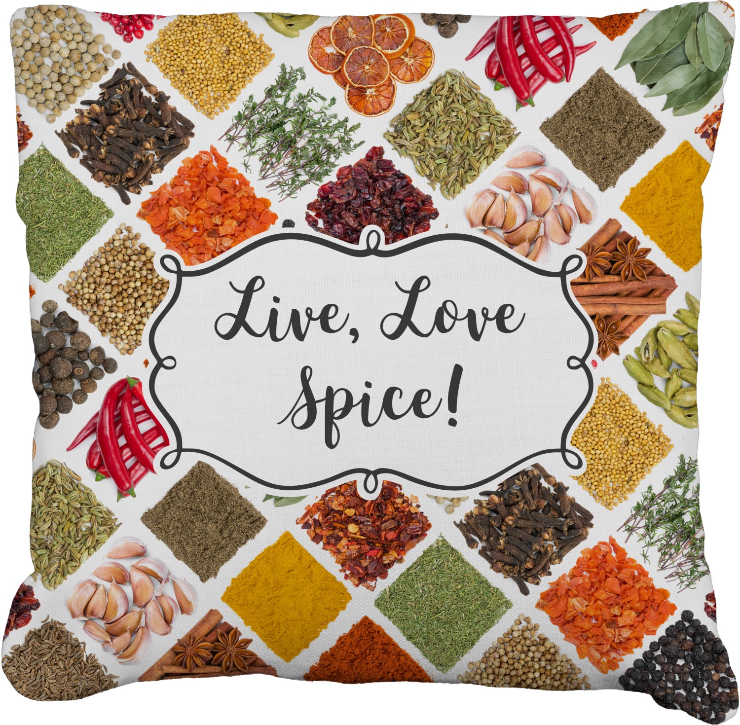The words "Live, Love, Spice" are featured in a curly frame in the middle of this design. You can easily customize the words to your liking. We have other herb & spice patterns in our library - so feel free to browse and use the pattern that appeals to you. Let us know if there is anything that we can help you with.