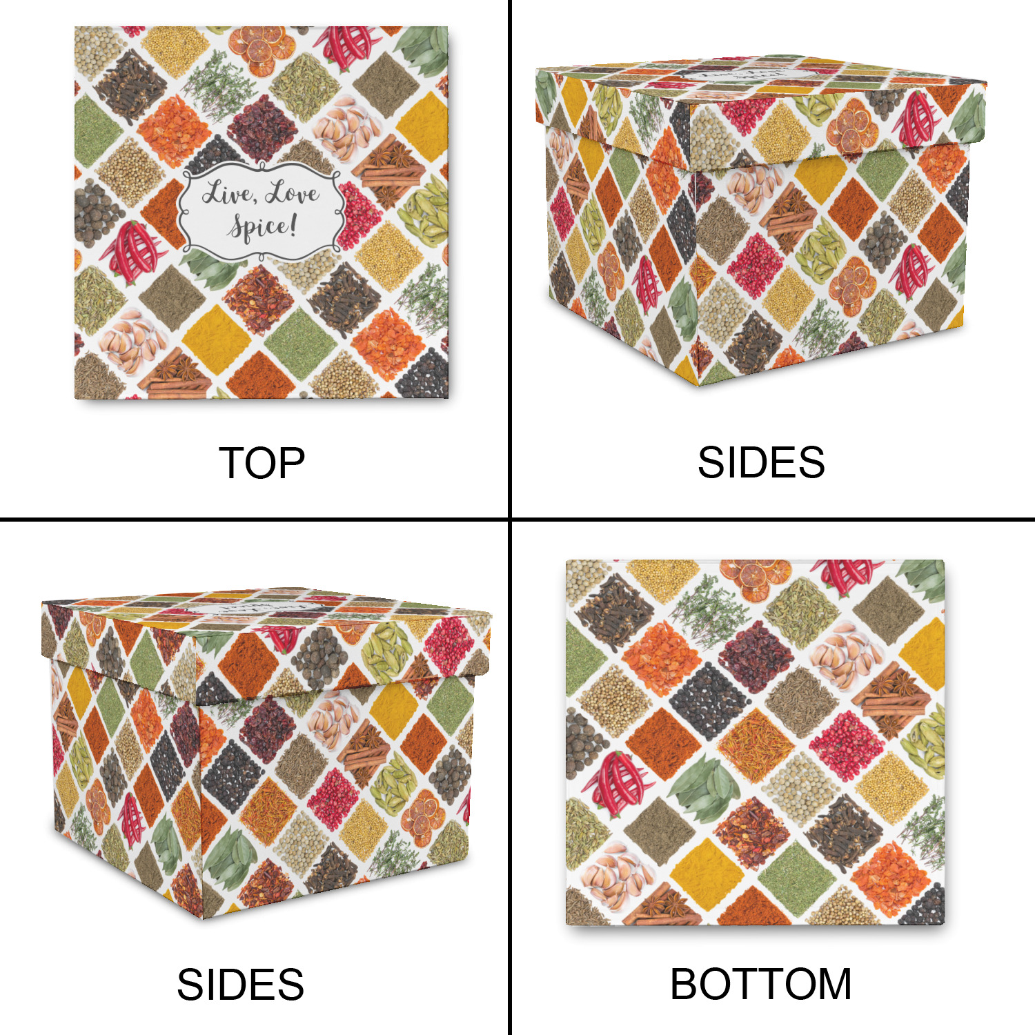 The words "Live, Love, Spice" are featured in a curly frame in the middle of this design. You can easily customize the words to your liking. We have other herb & spice patterns in our library - so feel free to browse and use the pattern that appeals to you. Let us know if there is anything that we can help you with.