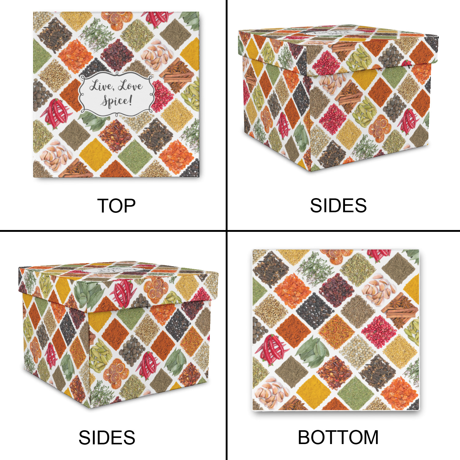 The words "Live, Love, Spice" are featured in a curly frame in the middle of this design. You can easily customize the words to your liking. We have other herb & spice patterns in our library - so feel free to browse and use the pattern that appeals to you. Let us know if there is anything that we can help you with.
