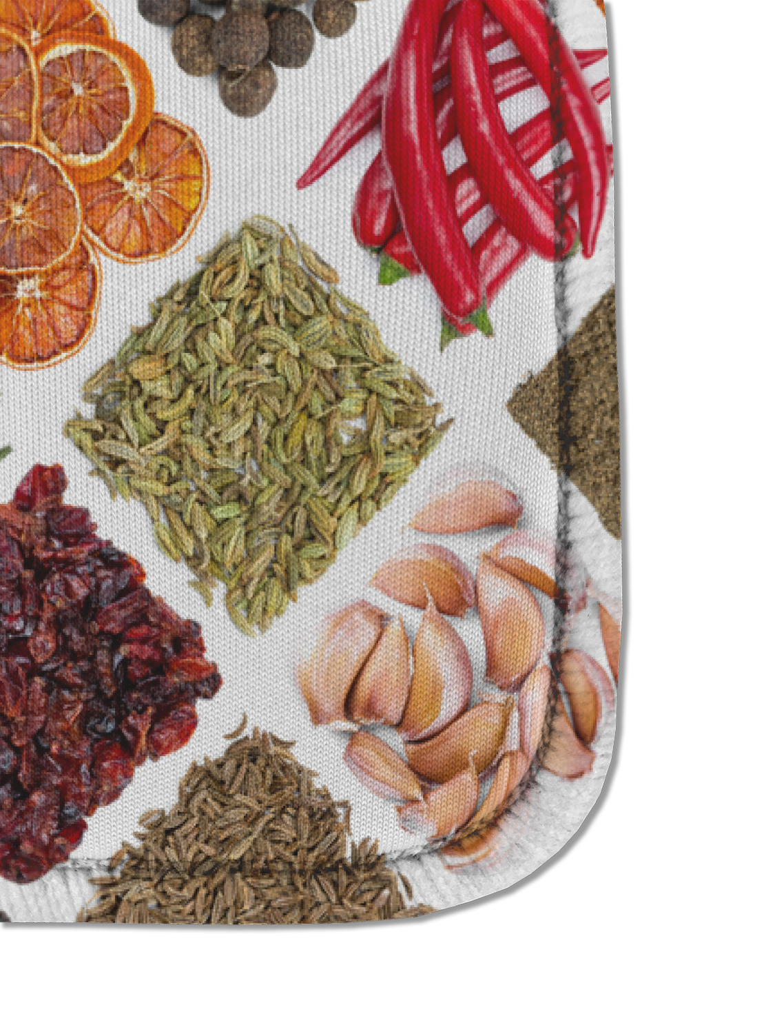 The main pattern is made of various spices such as dried thyme, white pepper, coriander, cumin, turmeric, red chili peppers and a whole lot more. The spices are all laid out in a fun diamond repeating pattern. This design simply looks stunning on any cook wear and more.