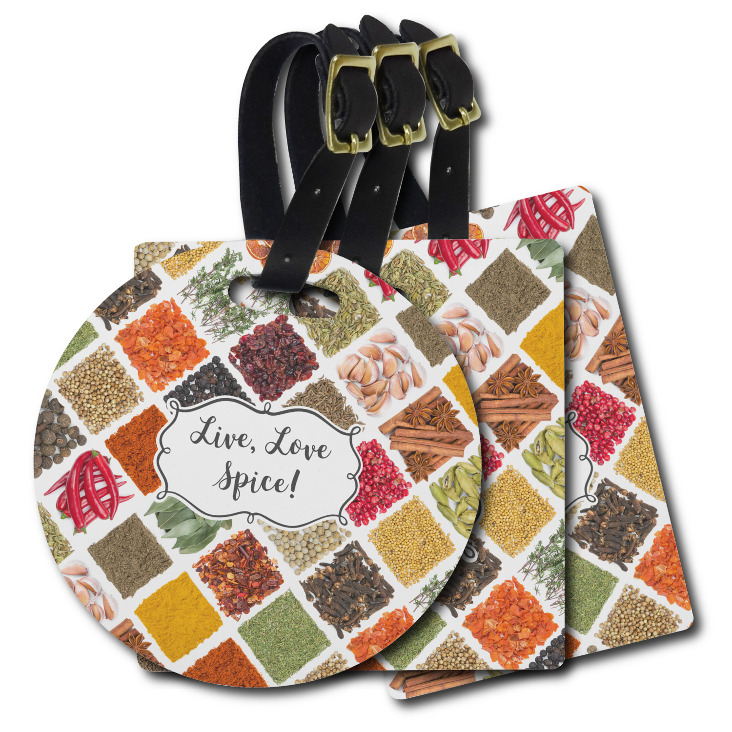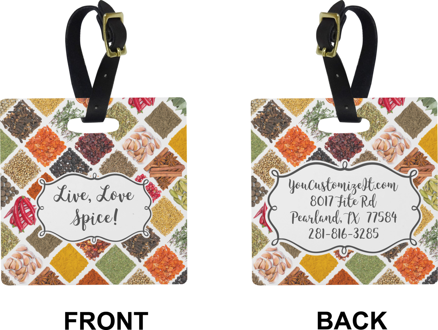 These personalized bag tags are sold in a variety of shapes, so that you may find the product that meets your vision exactly. We sell a round luggage tag, which measures at approximately 4" x 4". Our square luggage tag is about 3.5" x 3.5", while our rectangular version is 2.75" x 4 ".
