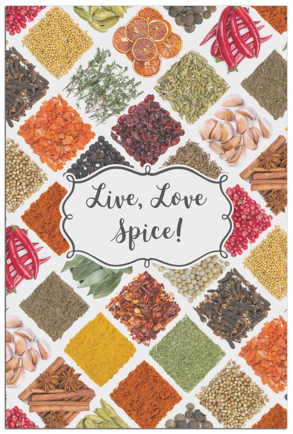 The words "Live, Love, Spice" are featured in a curly frame in the middle of this design. You can easily customize the words to your liking. We have other herb & spice patterns in our library - so feel free to browse and use the pattern that appeals to you. Let us know if there is anything that we can help you with.