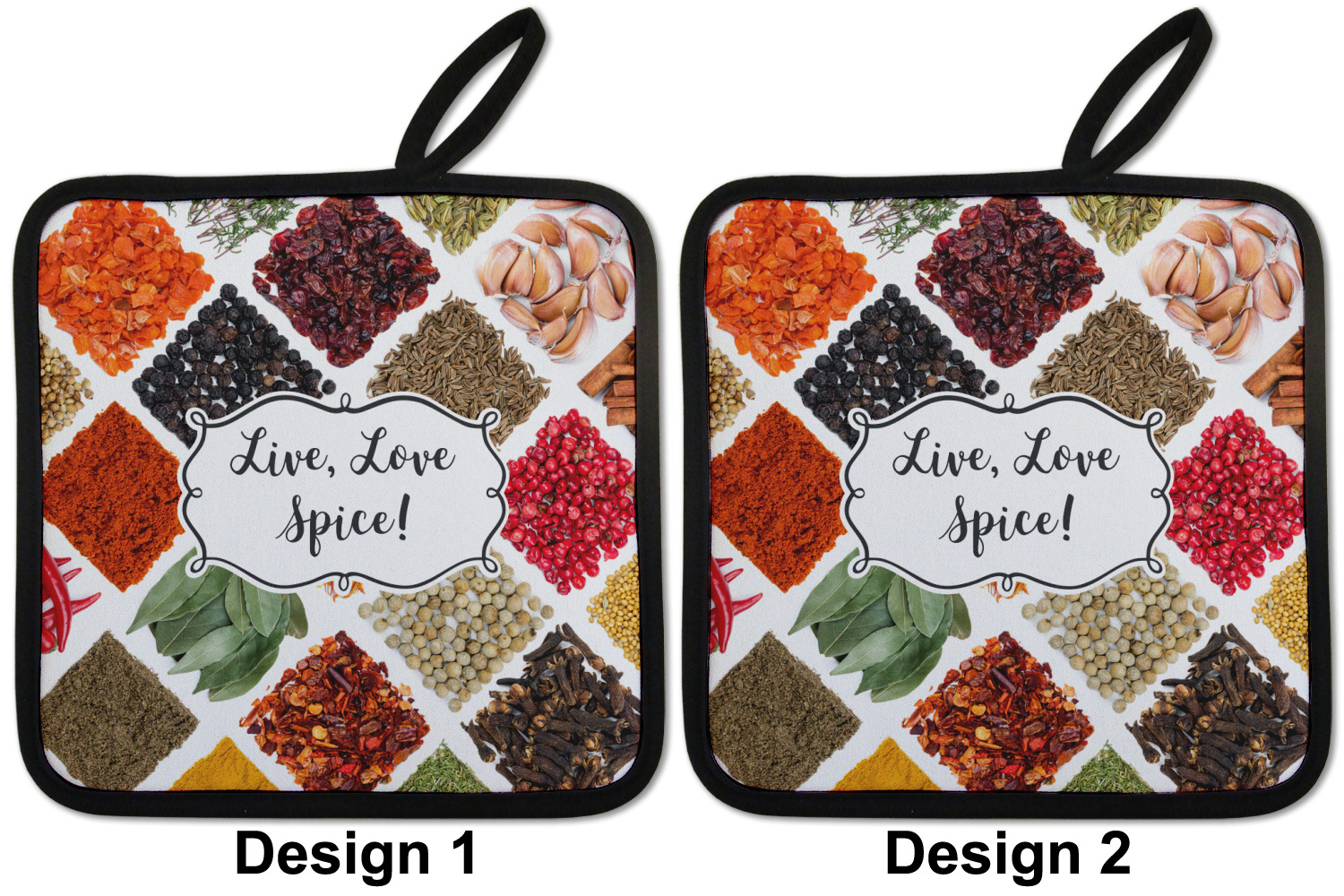 The words "Live, Love, Spice" are featured in a curly frame in the middle of this design. You can easily customize the words to your liking. We have other herb & spice patterns in our library - so feel free to browse and use the pattern that appeals to you. Let us know if there is anything that we can help you with.