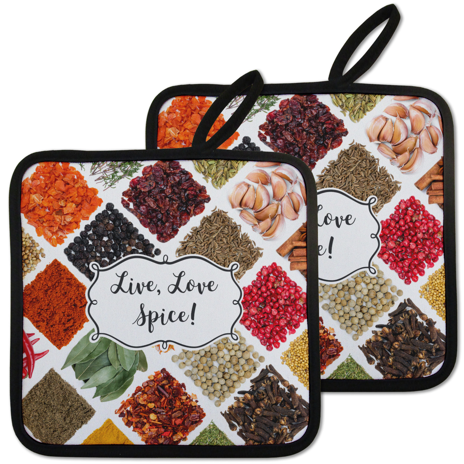 Our personalized pot holders feature a neoprene front that displays your personalization in vibrant colors. The backing of the hot pot holder is rubberized; the textured backing allows you to have a great grip when using this custom pot holder. The two materials are joined with a sleek, black trim, and the holder also includes an attached loop for hanging and storage. The pot holder is approximately 8.75 inches by 8.75 inches and 0.25 inches tall, while the fabric loop is 2.5 inches long. You can purchase a kitchen pot holder by itself or as a set of 2. We also offer a set including one pot holder and one oven mitt.