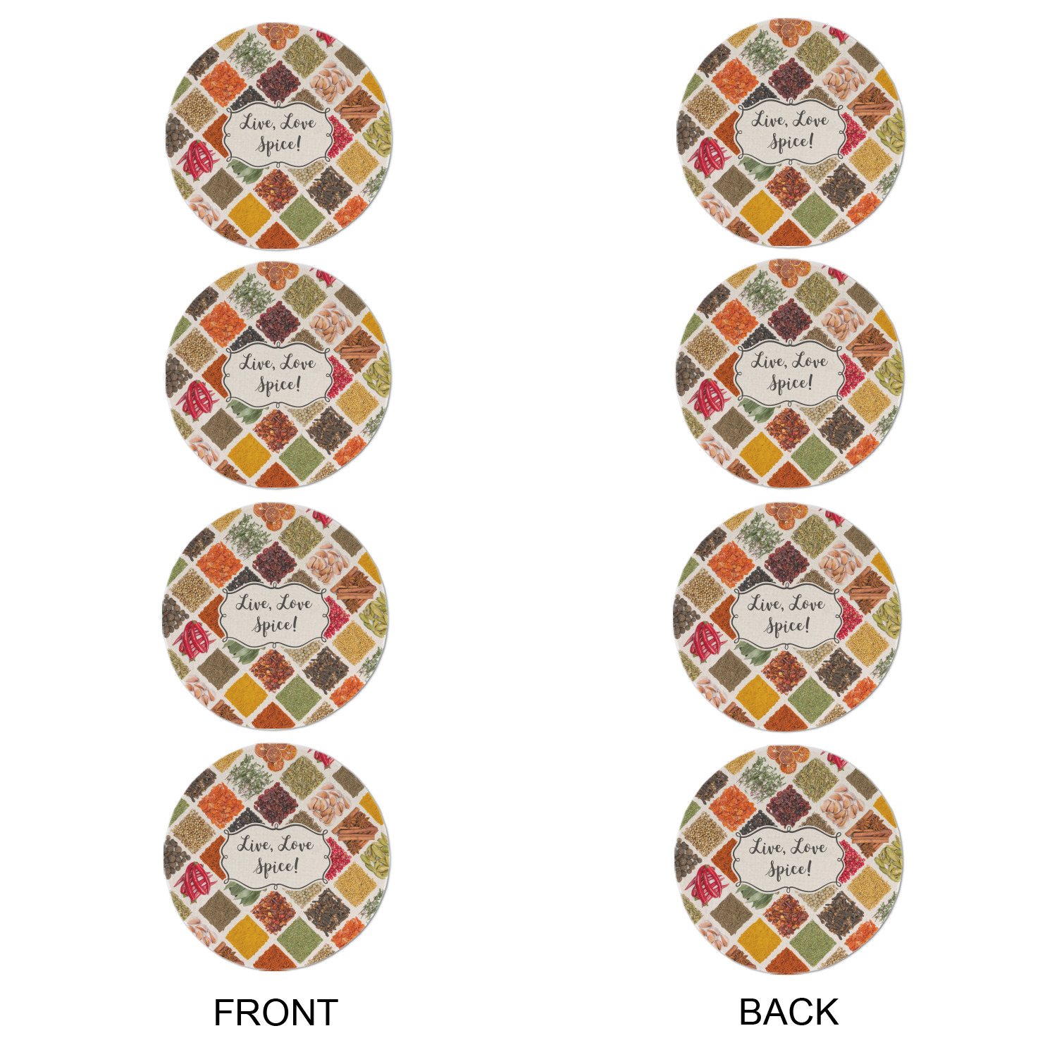 The words "Live, Love, Spice" are featured in a curly frame in the middle of this design. You can easily customize the words to your liking. We have other herb & spice patterns in our library - so feel free to browse and use the pattern that appeals to you. Let us know if there is anything that we can help you with.