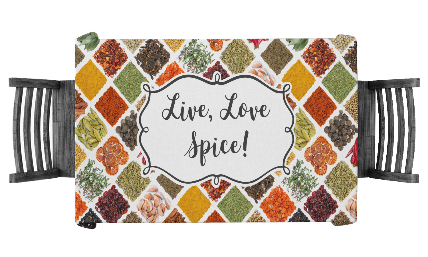 The words "Live, Love, Spice" are featured in a curly frame in the middle of this design. You can easily customize the words to your liking. We have other herb & spice patterns in our library - so feel free to browse and use the pattern that appeals to you. Let us know if there is anything that we can help you with.