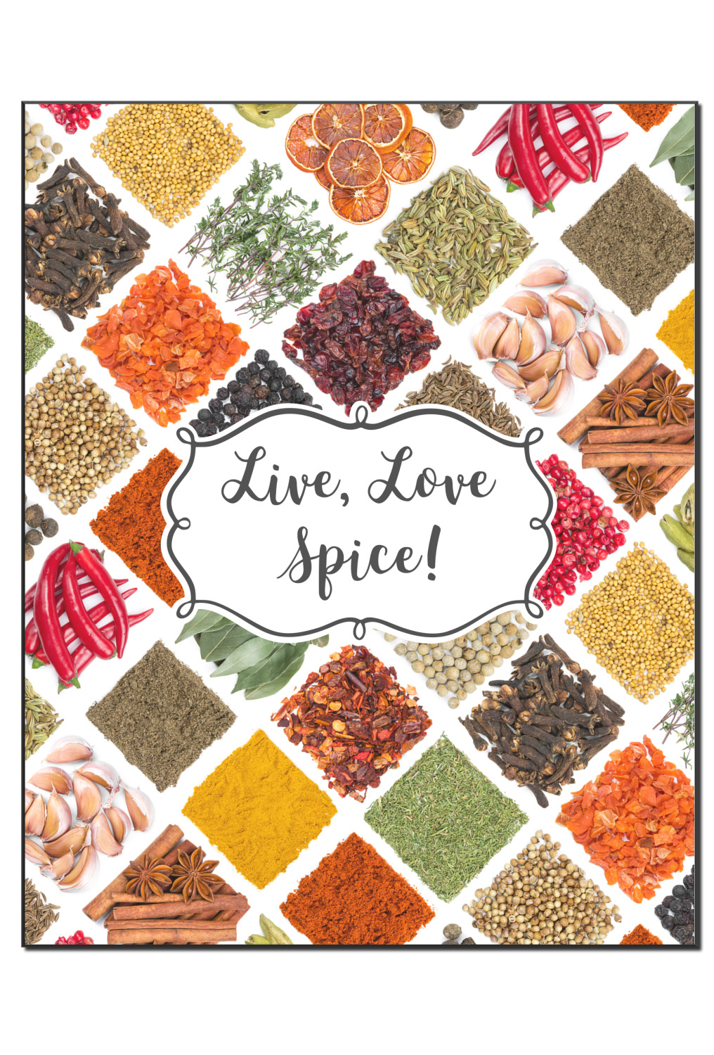 The words "Live, Love, Spice" are featured in a curly frame in the middle of this design. You can easily customize the words to your liking. We have other herb & spice patterns in our library - so feel free to browse and use the pattern that appeals to you. Let us know if there is anything that we can help you with.
