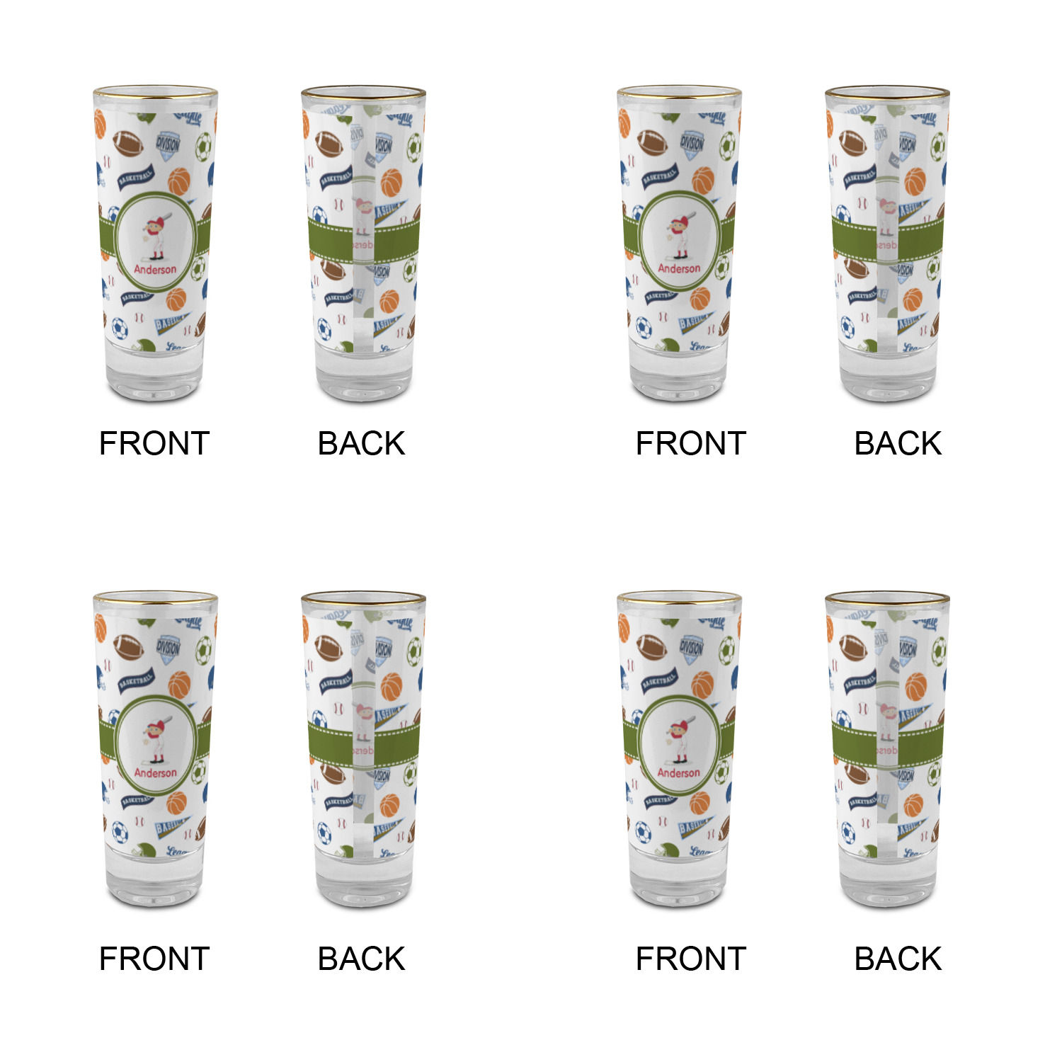 Baseball Player Designs for 2 oz Shot Glasses - Glass with Gold Rim - Set of 4