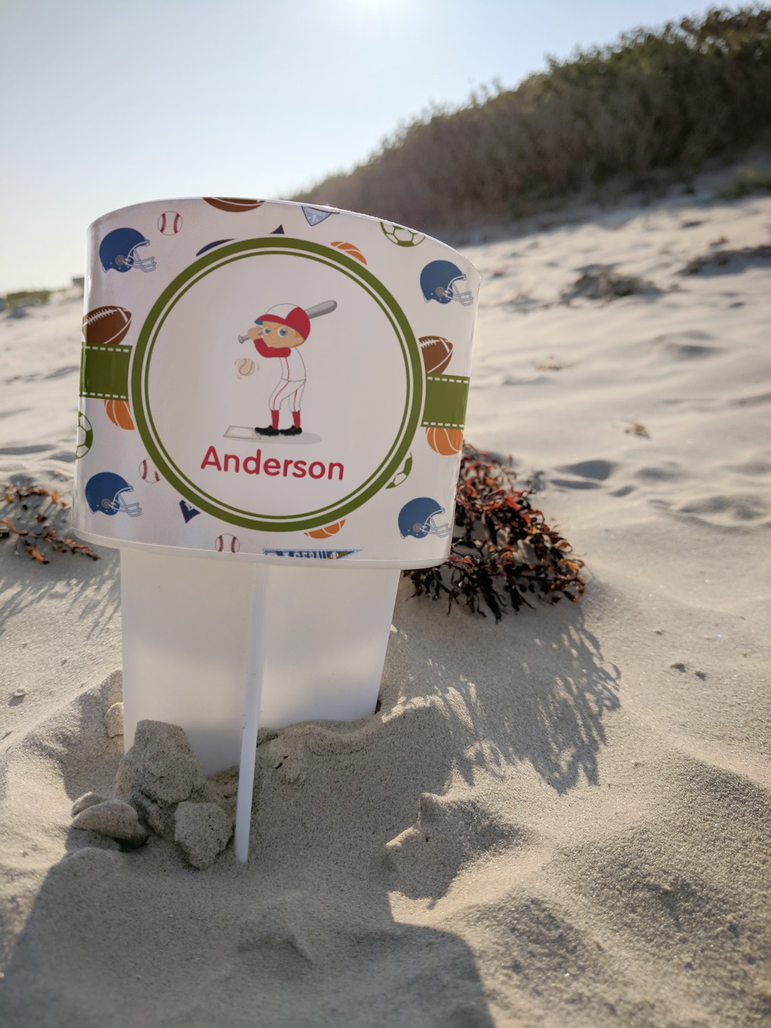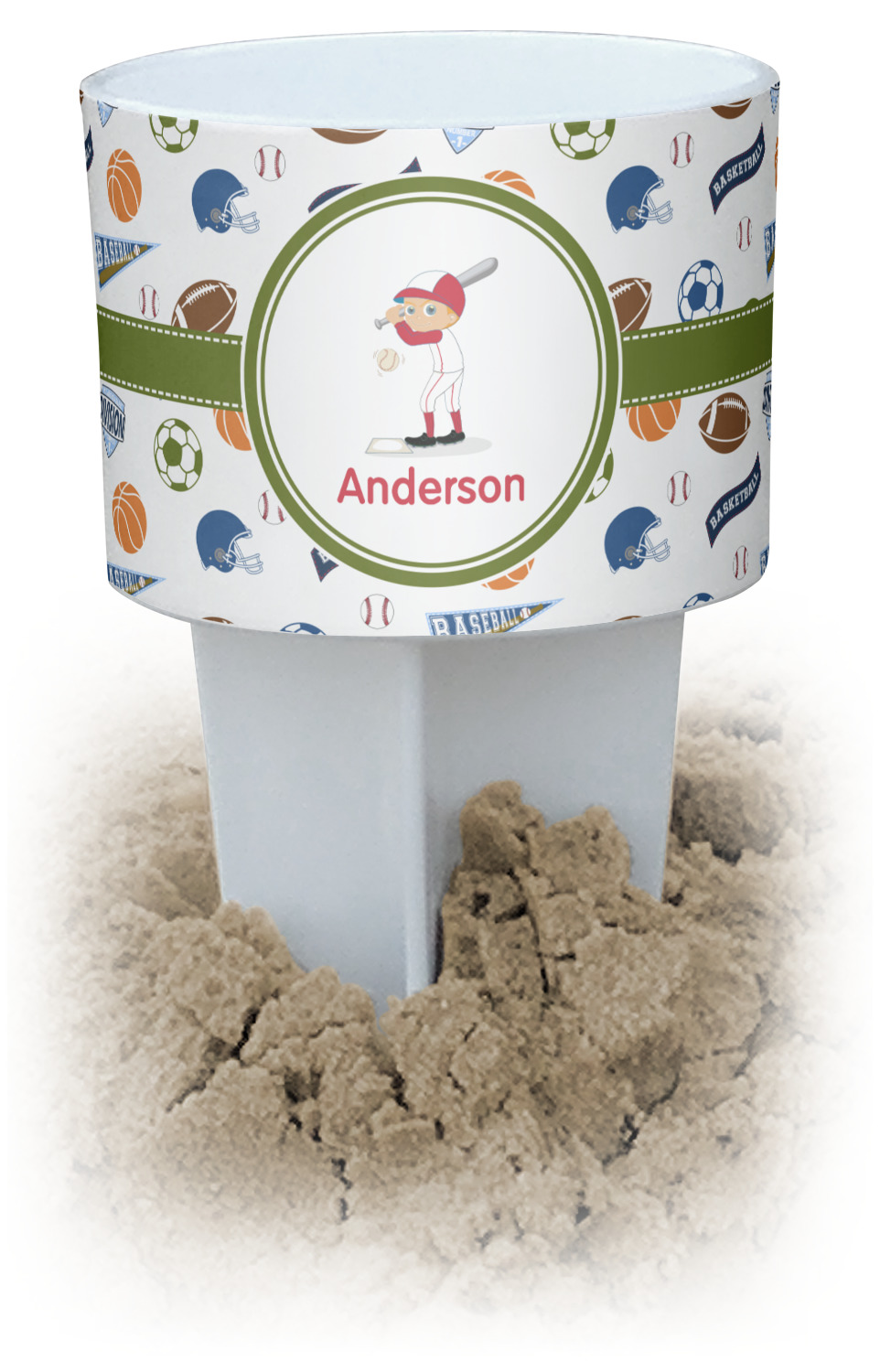 This cup holder has a large stake at its bottom that anchors it to the sand or ground below, while the cup holder rests above the stake. The entire drink holder is made of durable plastic and displays your customization around the cup holder portion. We sell these personalized beach spikers in two different colors: black and white.