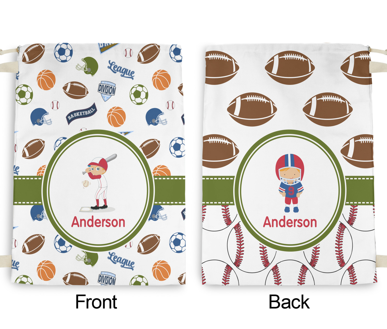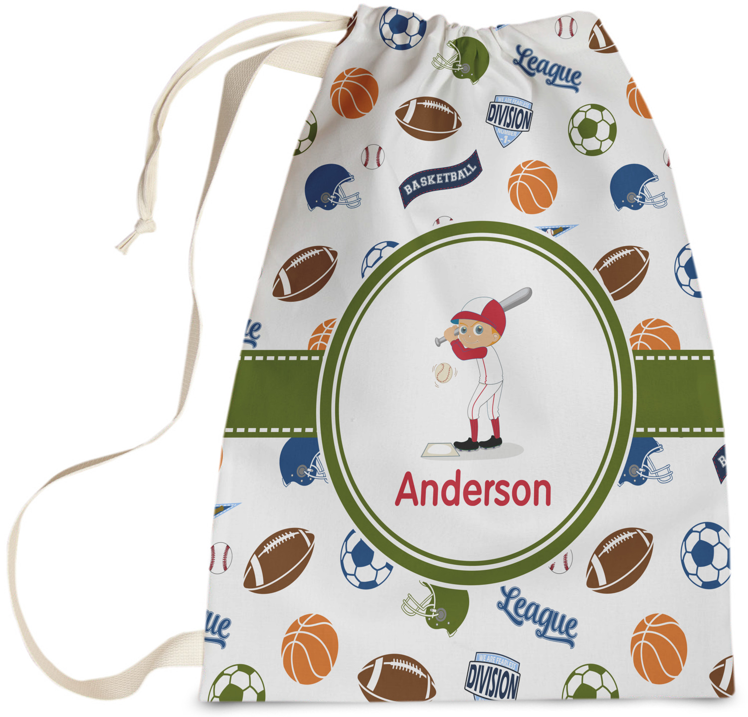 Carry your laundry in style with these customized laundry bags. Available in two sizes, featuring a natural colored woven strap and a cinch cord, these bags hold a lot of clothes or anything else you want to fit in them.