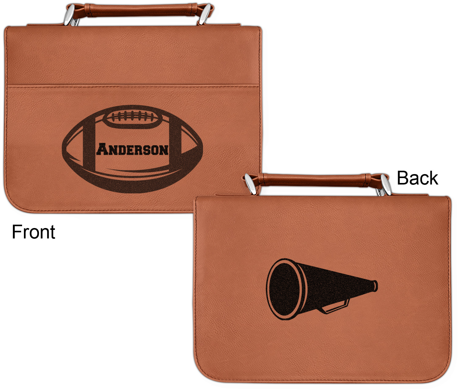 These book covers are fabricated from a fine leatherette in a warm, cognac shade of brown. A wide pocket spans across the front of the book jacket [2,400] and can store any loose papers or notes that you wish to keep. The interior of this personalized Bible cover includes slots on both sides to house the covers of your Bible, and keep it in place. The inside of the spine has a small elastic band to secure a pen. A zipper lines three sides of the cover, while the fourth side features a reinforced handle that allows for easy transport of your enclosed book.