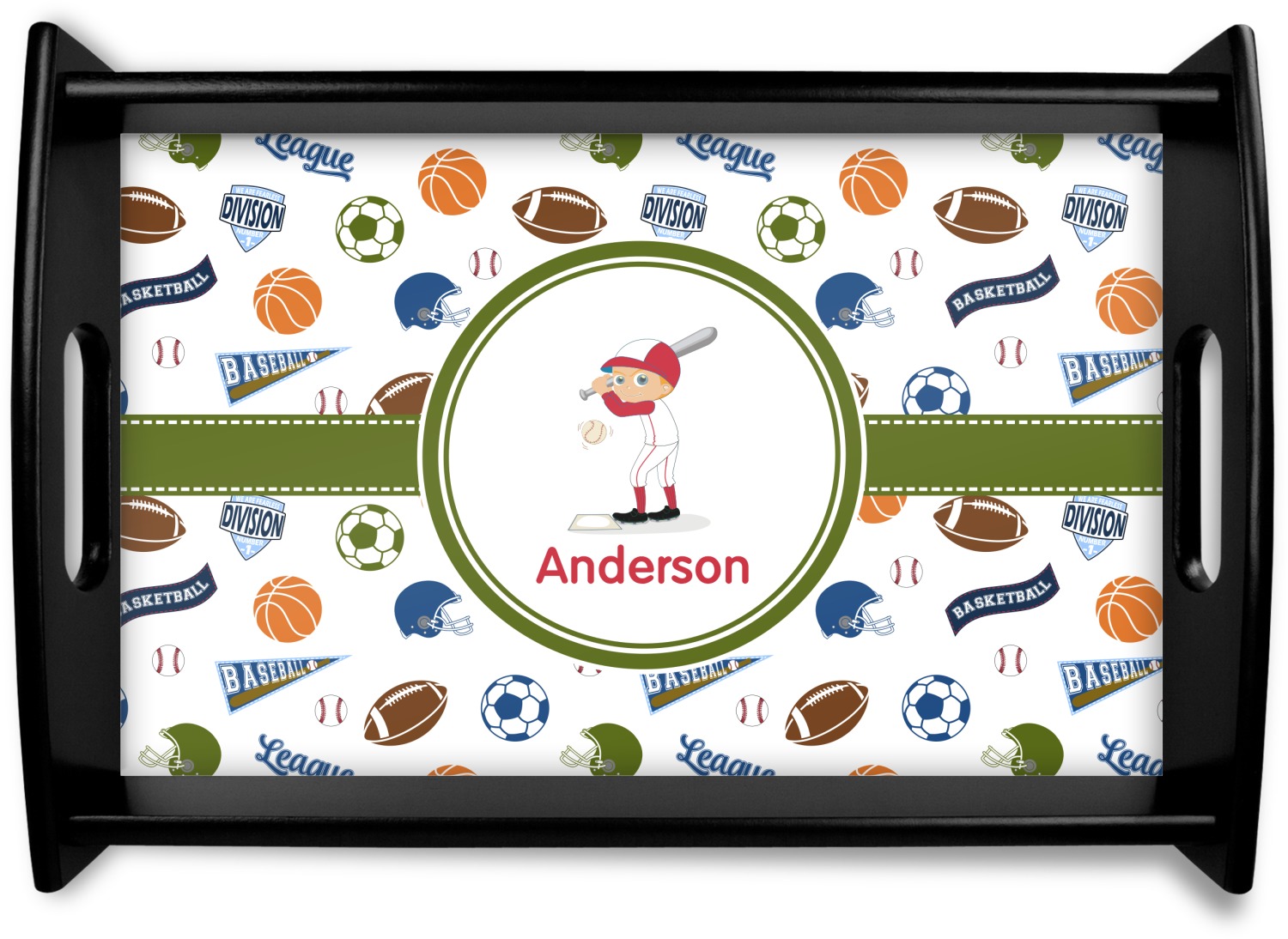 This serving tray with handles features square edges and two rounded sides, creating a very modern look. Each side is fabricated from a beautifully cut, natural wood. The bottom of the interior of the tray displays your customized design in bright, vibrant color. The tray is sold in both a black color and a natural wood look. Each variation of the wood serving tray has two sizes: Small, which is 14" x 10" x 2.25", and Large, which is 19.5" x 13.5" x 2.75".