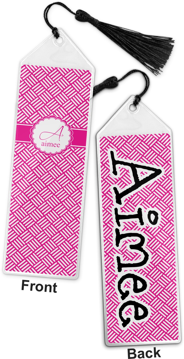 Your personalized bookmark is made of a sturdy, clear vinyl, and is approximately 7.5" x 2.25". We display your personalization on vinyl inserts that are placed on both sides. Accompanying each book marker is a black, fringe tassel that attaches to the reinforced, triangular header.