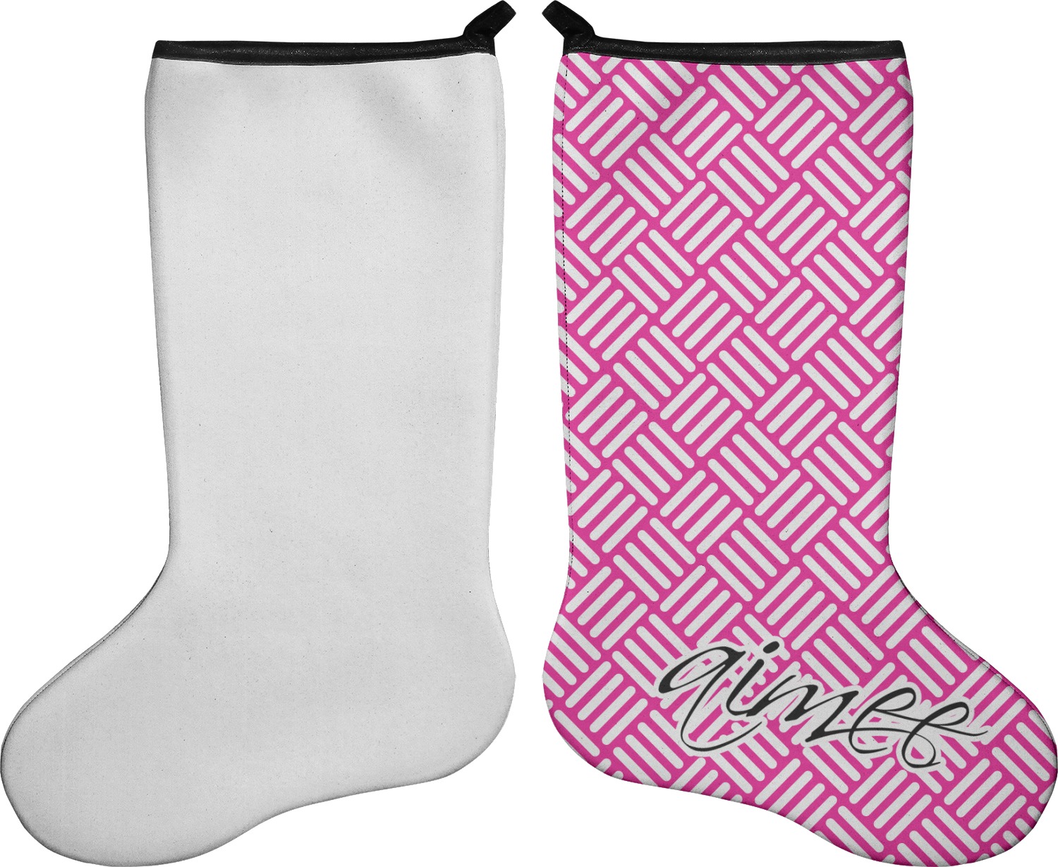 These 17" x 11" stockings are made of neoprene and have a black trim to give them a fantastic finished look. Your very own design is printed right onto the stocking, either single sided with white on the back or double sided where can use the same or different designs / patterns on the front and the back - the choice is yours. At the top of the stocking is a 2" loop for hanging.