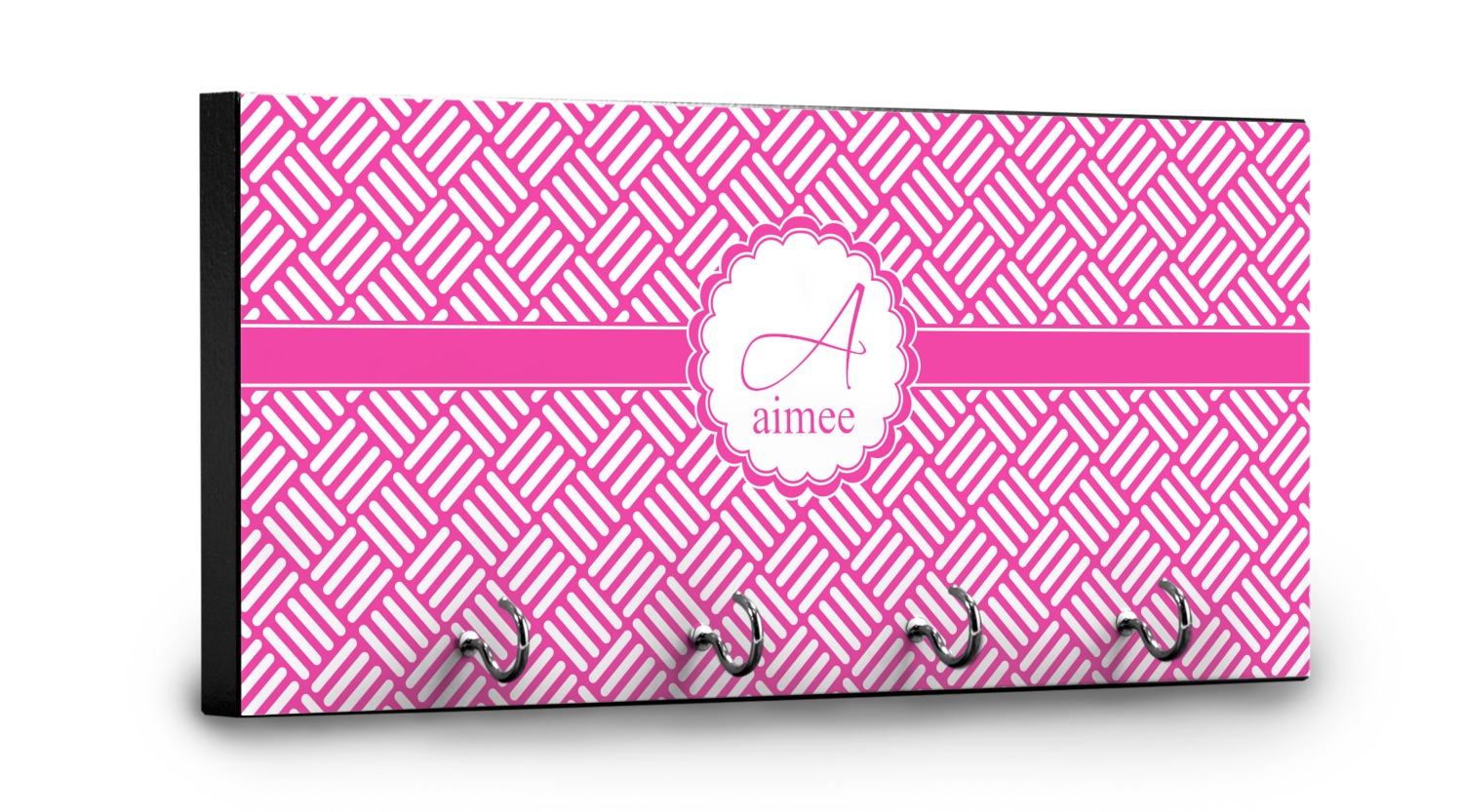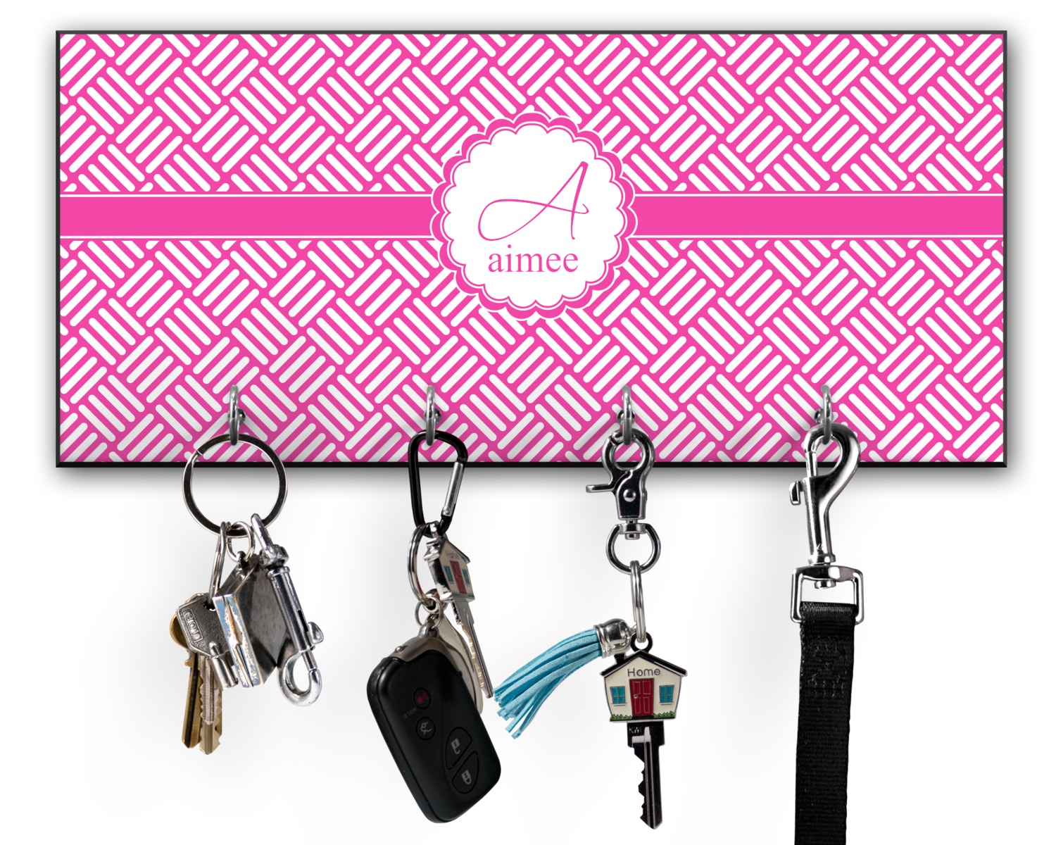 This 11" x 5" key hanger is made of sturdy wood and has four metal hooks lining the bottom. This is the perfect size for a family with several drivers. Not only can you hang keys on it though, but pet leashes and other small items. The board is black on the sides and back and is printed with the design of your choice on the front.
