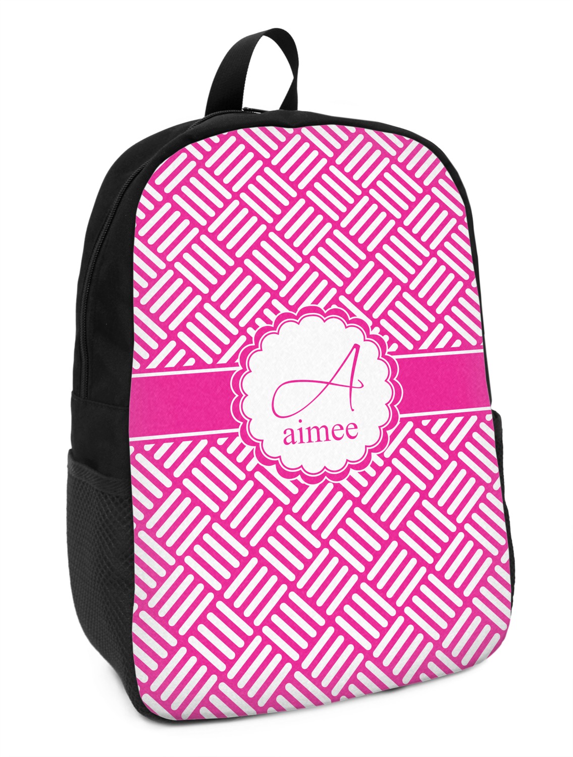 These small backpacks are made of a durable black canvas material with your personalization right on the front. The two shoulder straps are padded and easily adjustable. The bag itself measures at about 11" W x 15" H x 5" D. It's the perfect size for elementary aged kids or adults who want a smaller backpack. On the top of the bag you will find a handle to hang or carry your backpack by as well as a large zipper closure to keep all of your belongings safe inside. On each side of your backpack is a mesh pocket for a small item or water bottle. Inside your backpack you will find a spacious area with a small zipper pocket and a padded laptop slot that will fit up to a 13" laptop (13" being very snug). This is the perfect bag for any student that needs a couple books and their laptop with them at all times. It also works great as a carry on for traveling!