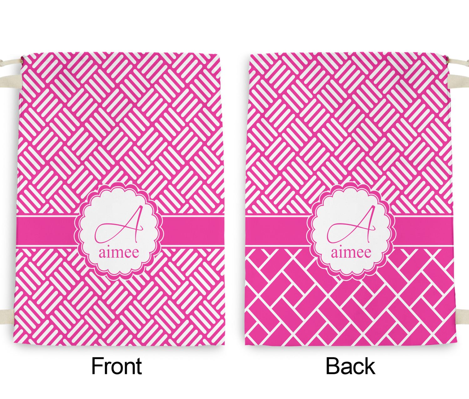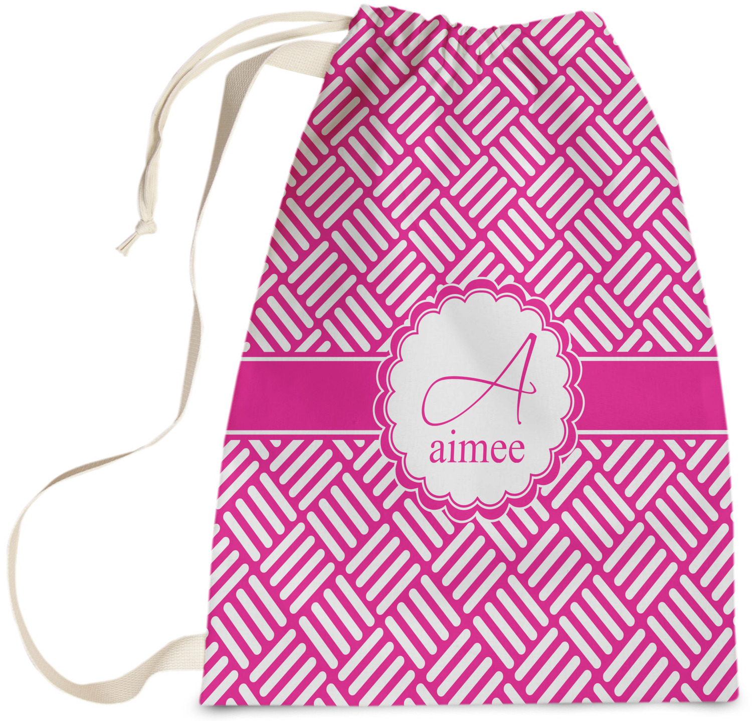 Carry your laundry in style with these customized laundry bags. Available in two sizes, featuring a natural colored woven strap and a cinch cord, these bags hold a lot of clothes or anything else you want to fit in them.