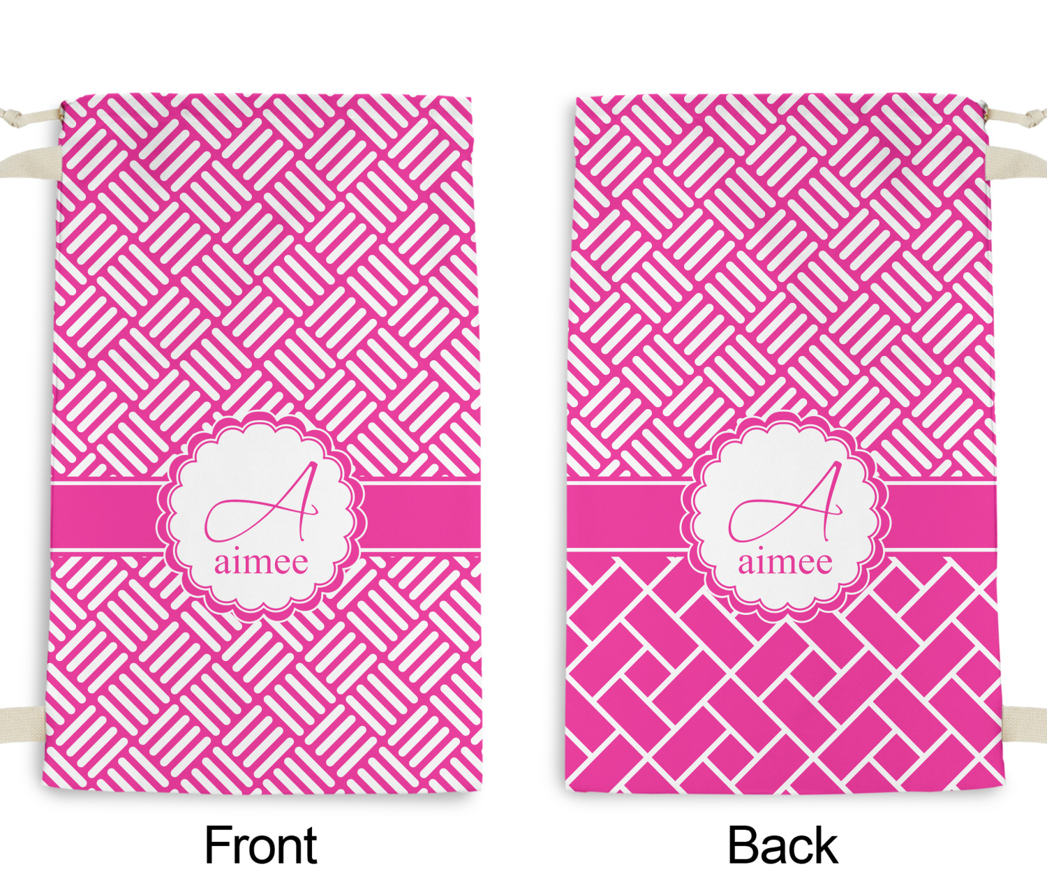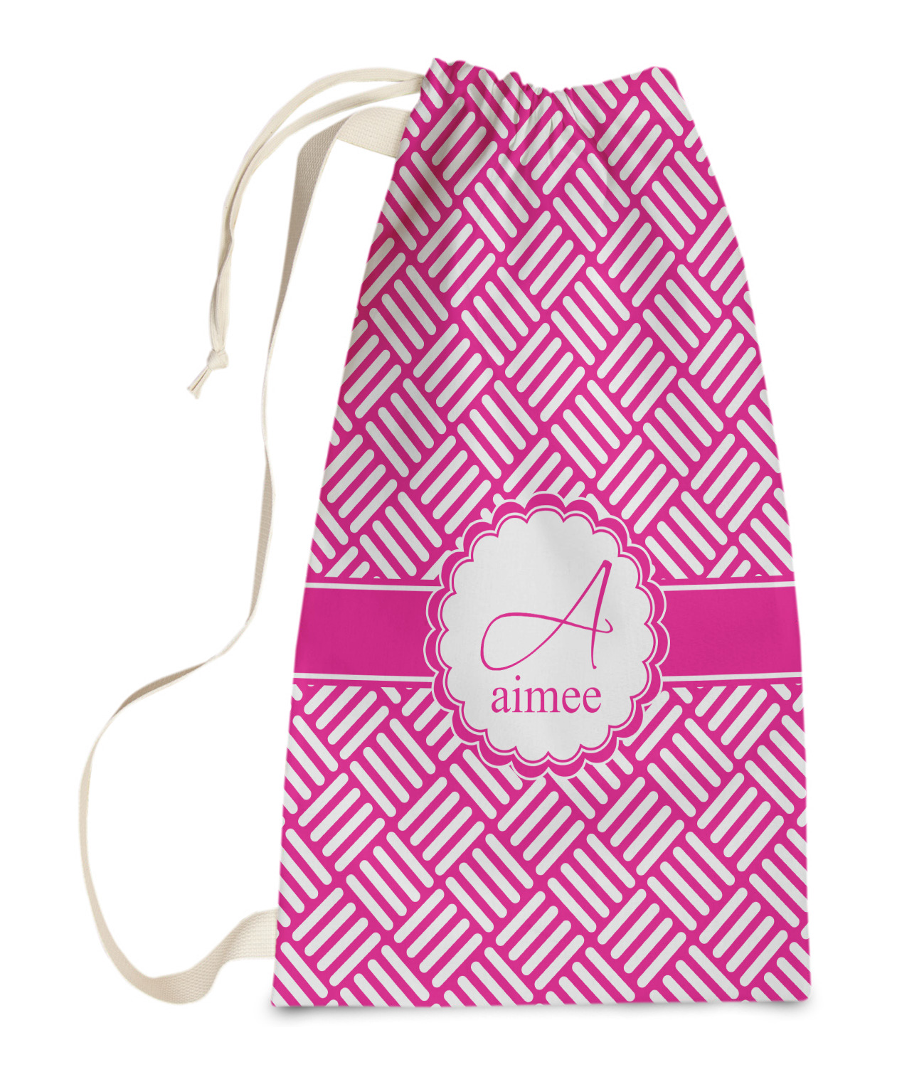 Carry your laundry in style with these customized laundry bags. Available in two sizes, featuring a natural colored woven strap and a cinch cord, these bags hold a lot of clothes or anything else you want to fit in them.