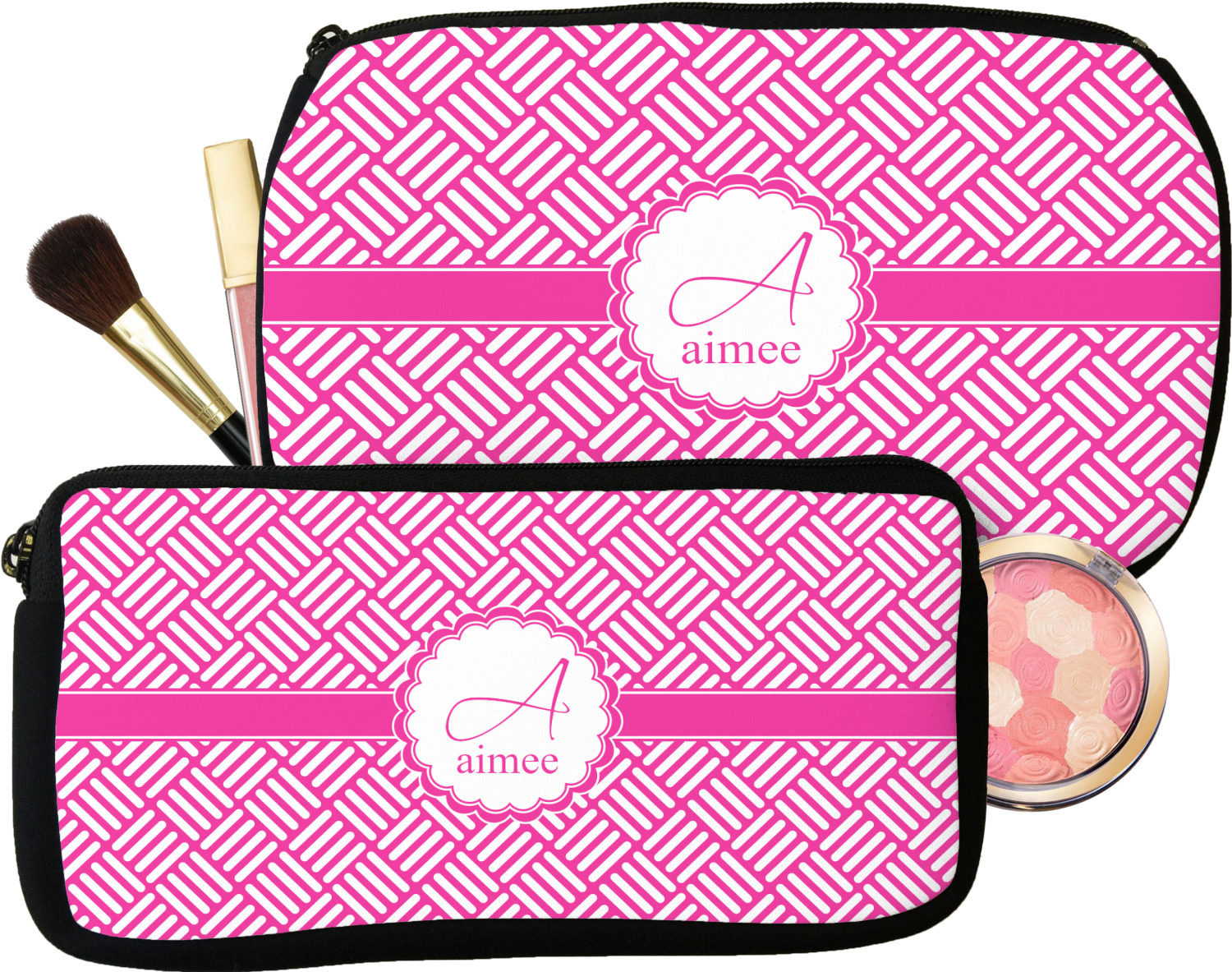 Our personalized makeup bags are available in many different designs, patterns and colors - so you are sure to find one that will love. They are made of neoprene (same material as wet-suits) and thus are water resistant, so spillages in your makeup bag will not end up all over you purse. They are customized on one side and are black on the other side and the zipper is black as well.