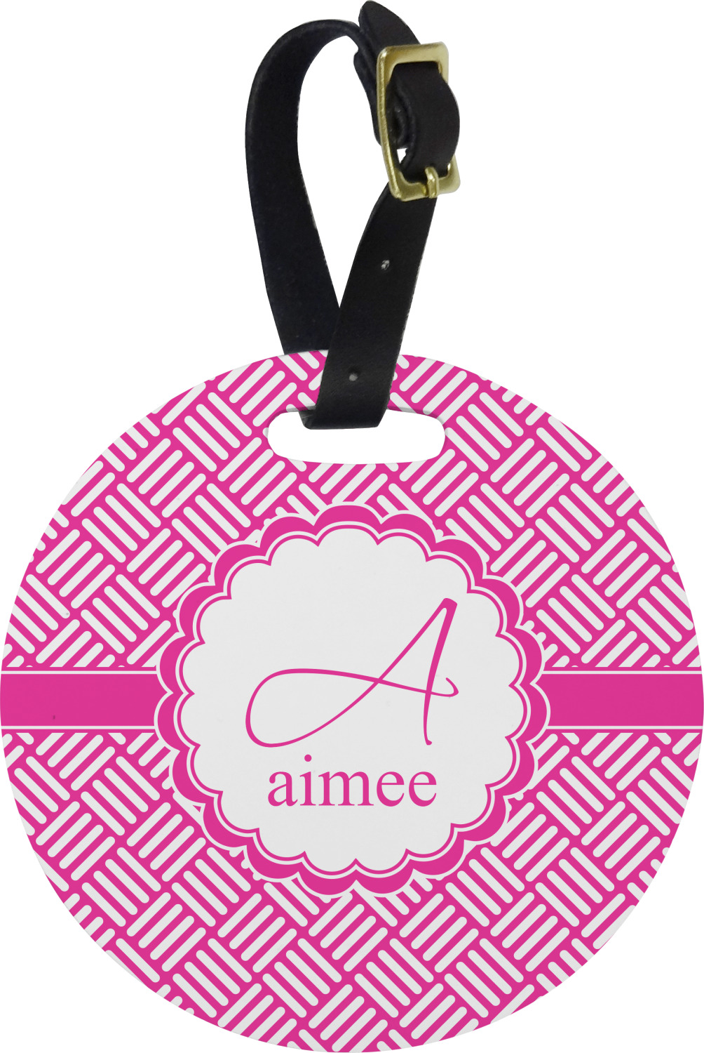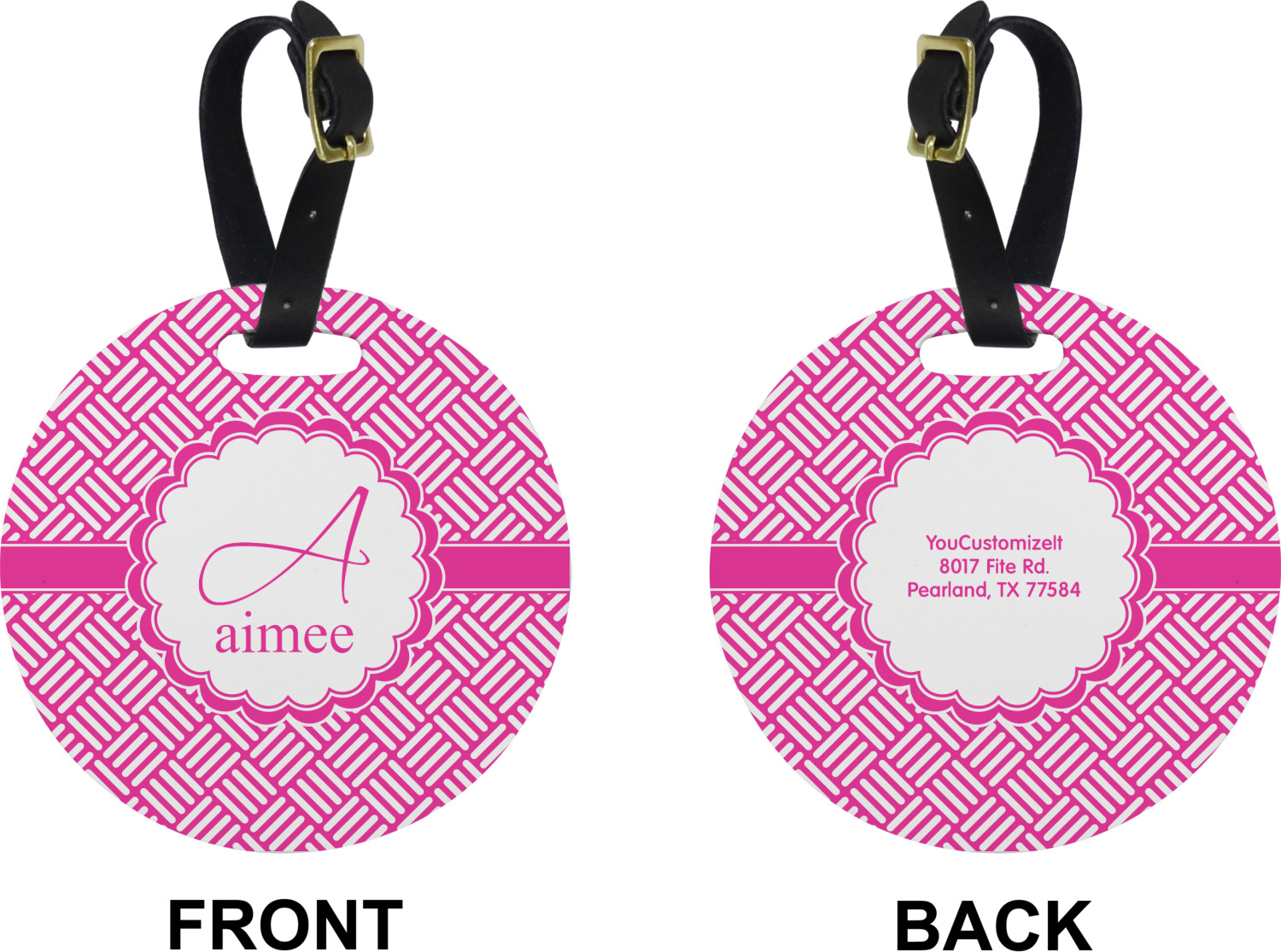 These personalized bag tags are sold in a variety of shapes, so that you may find the product that meets your vision exactly. We sell a round luggage tag, which measures at approximately 4" x 4". Our square luggage tag is about 3.5" x 3.5", while our rectangular version is 2.75" x 4 ".