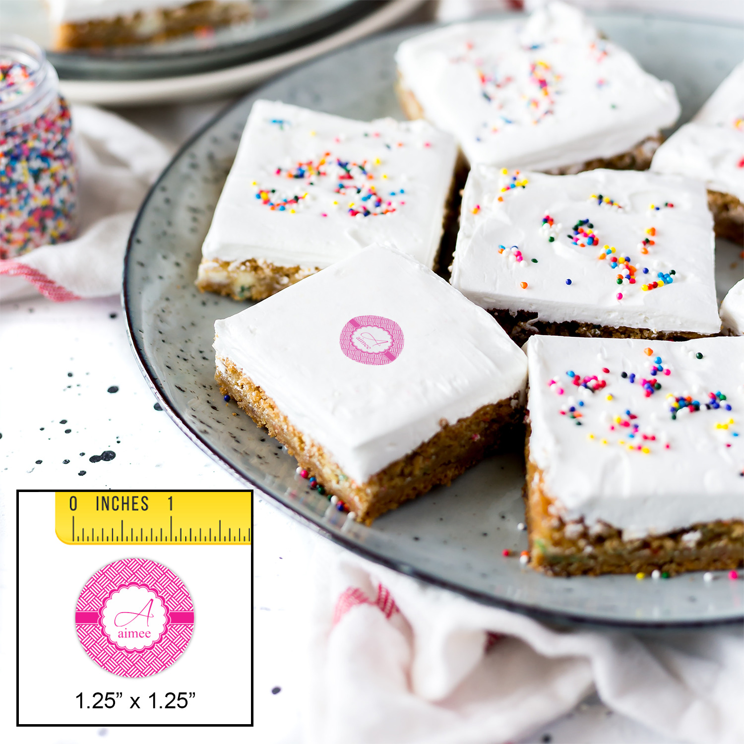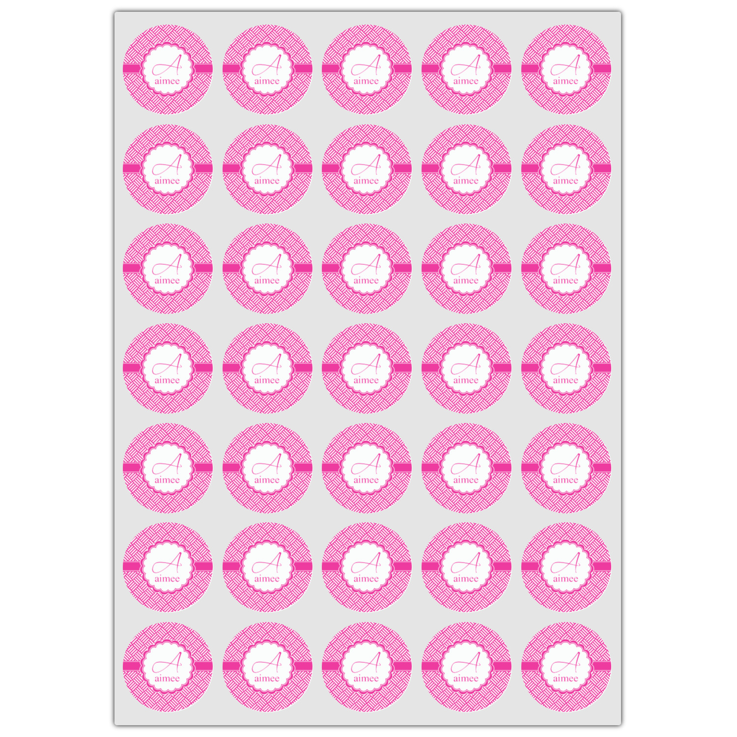 A quirky, scalloped circle label adorns the design. Add your name and initial for that special touch.