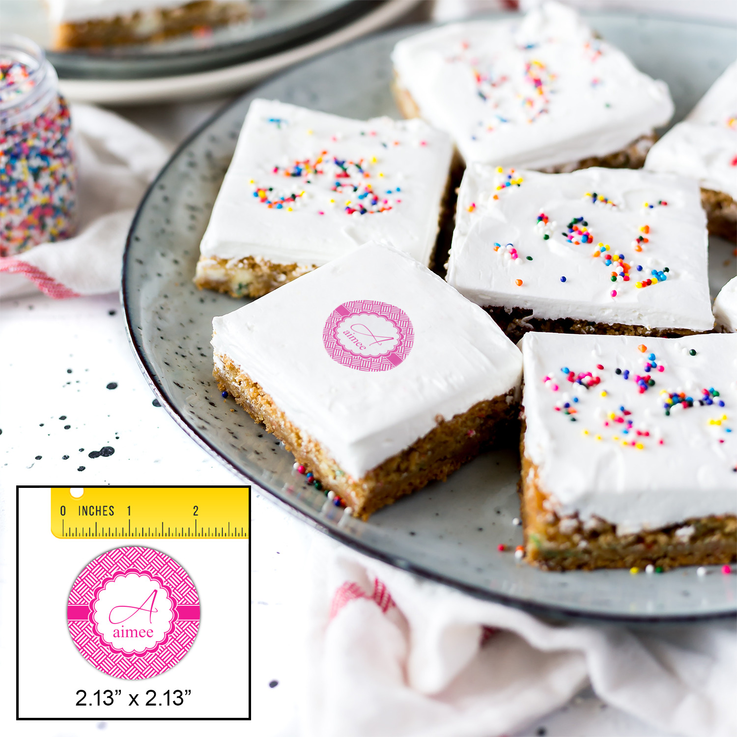 A quirky, scalloped circle label adorns the design. Add your name and initial for that special touch.