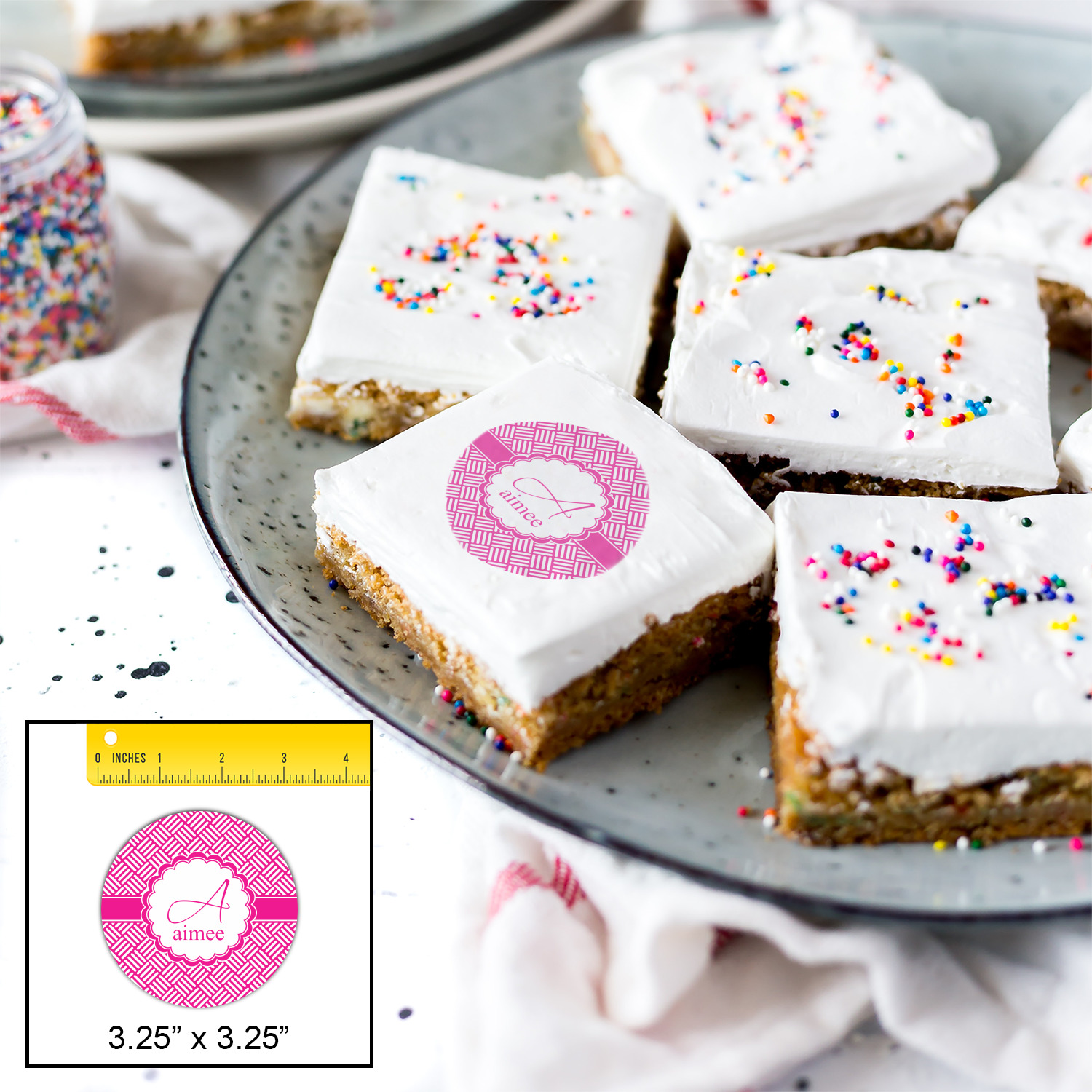 A quirky, scalloped circle label adorns the design. Add your name and initial for that special touch.