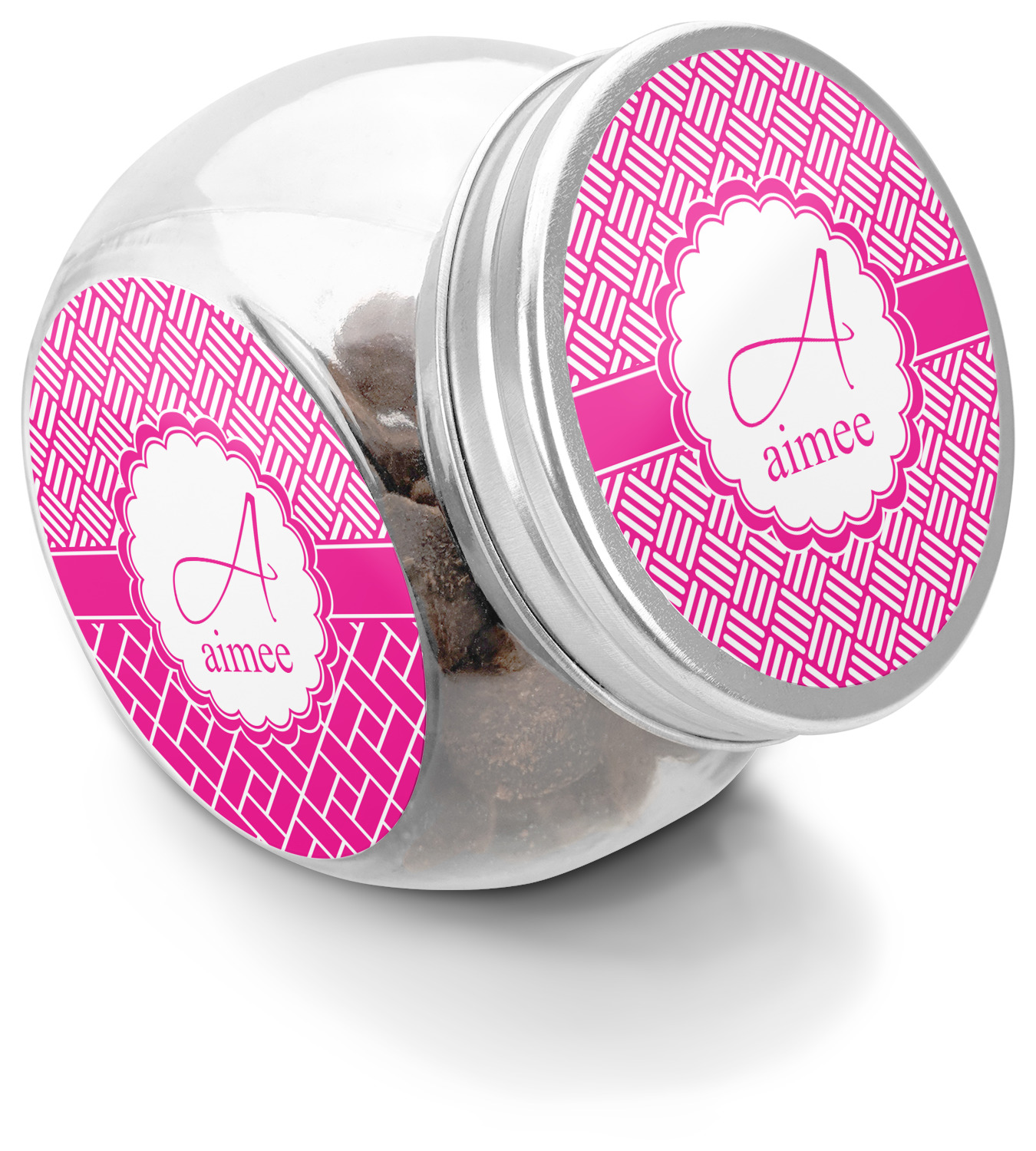 This treat jar is an excellent way to store treats for your favorite canine or feline. Moreover, their delicate, classy appearance makes them a tasteful addition to your countertop's décor. Crafted from clear glass, its unique construction and silver metal, screw-on lid allows for quick and easy access. Three, permanent, vinyl stickers are applied to both sides of the jar and lid, presenting your personalized design. The base of this glass, dog treat jar is 3.4" x 4.75", and the jar stands at 5" tall. Though on the smaller side, this jar is best suited for smaller treats or training treats.