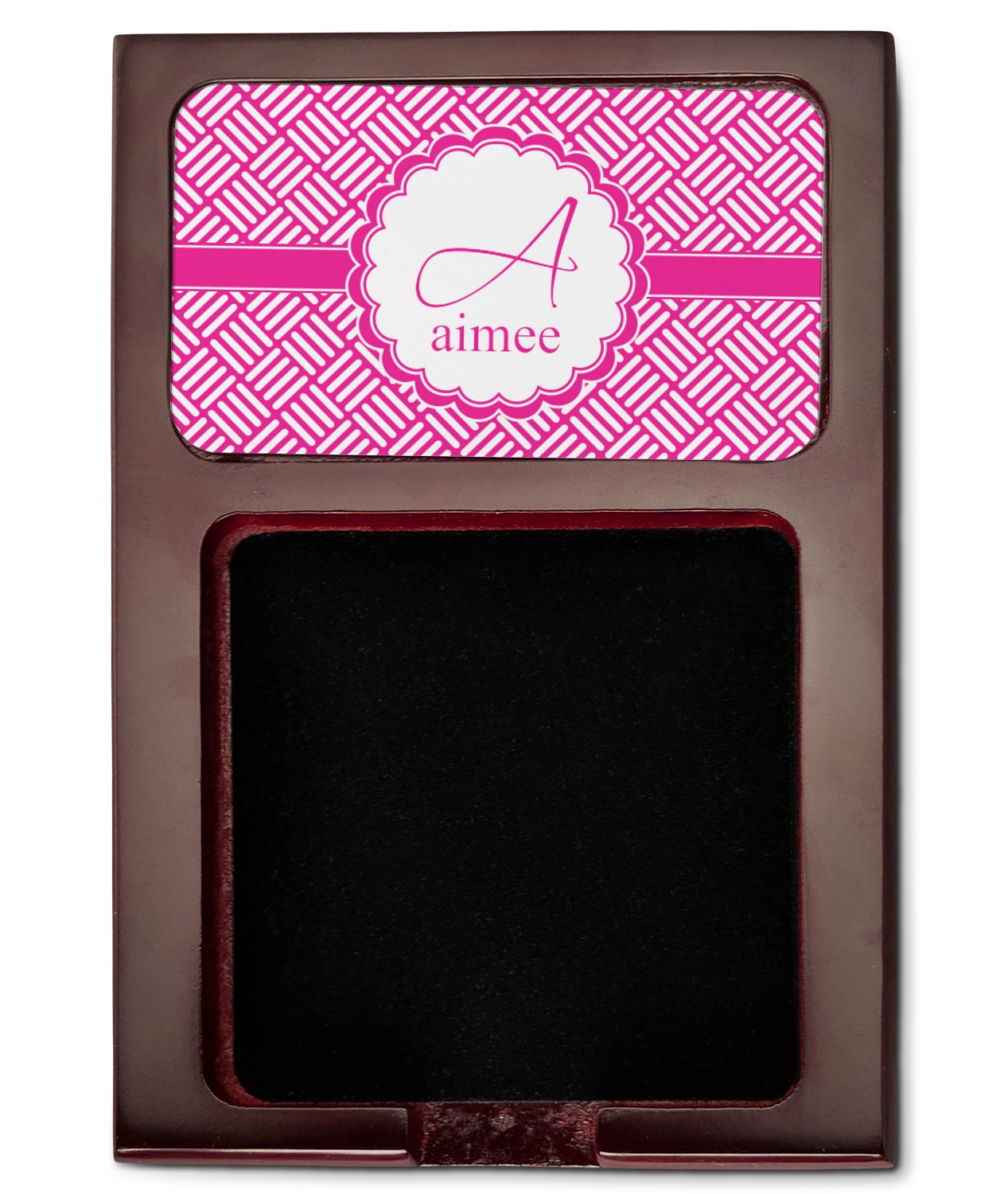 Crafted from a fine mahogany, this post it note holder is in the shade of a dark, cherry color. The dispenser itself is about 4.25 by 6.25 by 0.75 inches. You can place your 3 by 3 inch sticky notes in the indentation below the nameplate. We print your customization onto the nameplate that rests above the velvety indentation.