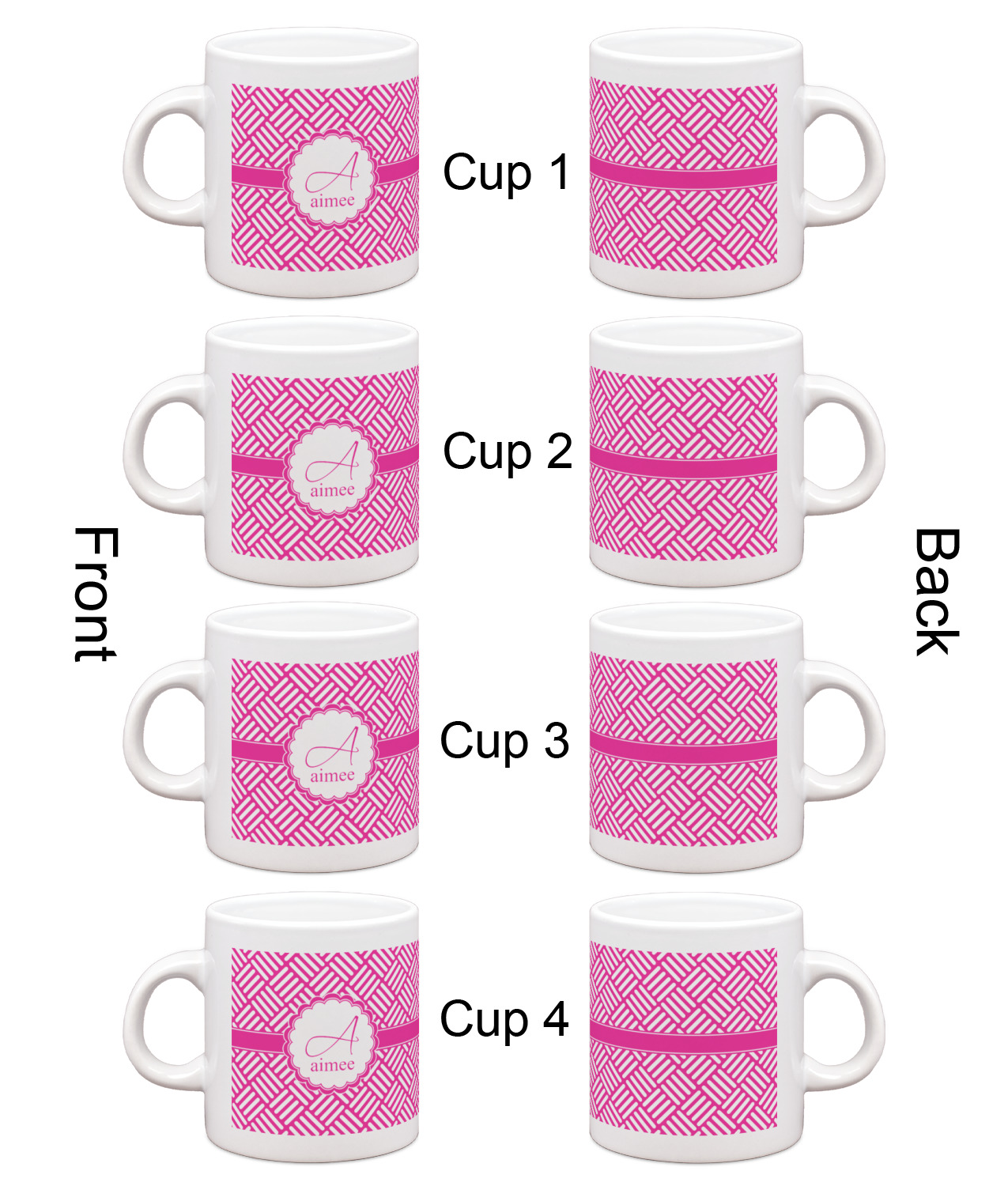 Each of our espresso mugs is a ceramic material sure to keep your drink warm. Personalize one cup for yourself, or order a set of 4! Its the perfect little gift for any coffee lover! We carry two sizes for you to personalize - 3 oz. (approx. 3.25" x 2.325" x 2.625") or 6 oz. (approx. 4" x 2.9" x 2.9"). Our 3 oz. mug is perfect for that single shot espresso while our 6 oz. mug can be your next favorite cappuccino cup holding two shots of espresso!