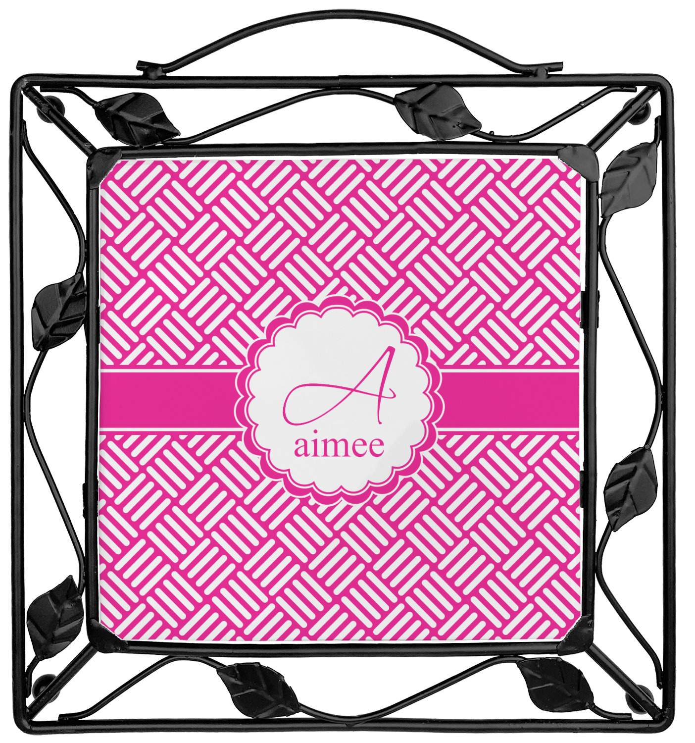 Our square trivets are made from a durable, wrought iron. This model features 4 small half circles, one on each corner, and a larger ring of iron that circles the central, customized tile. Each of the 4 corners has a round foot on its bottom for stability. This trivet is 8.75 by 8.75 inches, but the central tile measures at 6 inches on both sides.