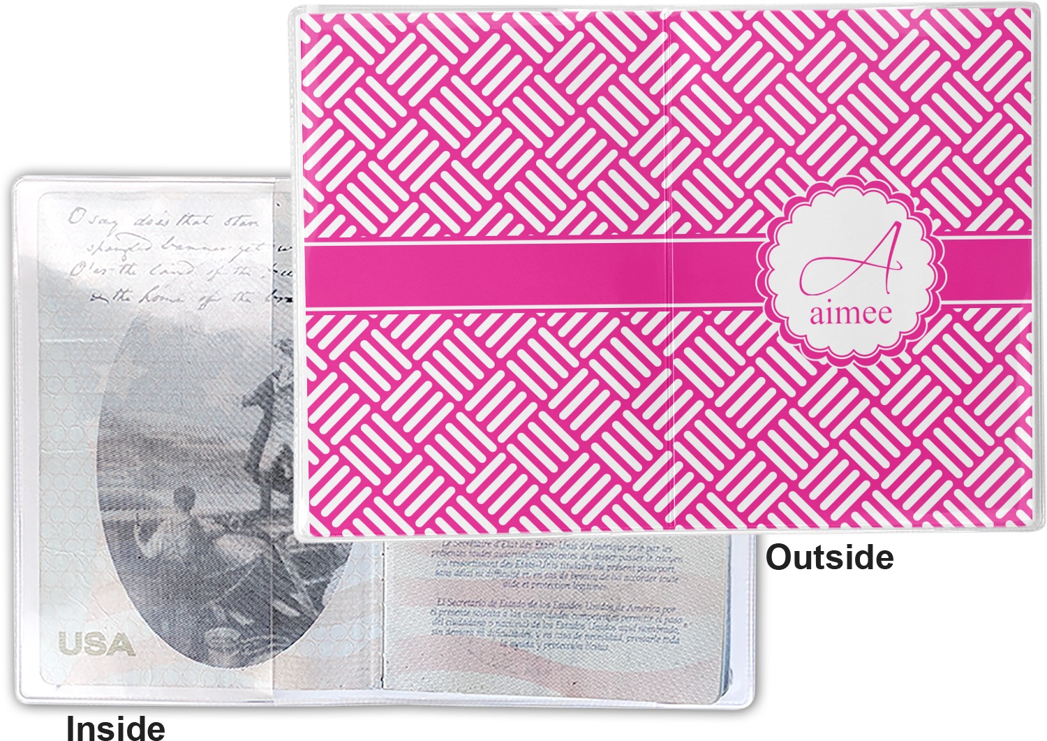 This cover is made of a sturdy clear vinyl with a personalized vinyl insert inside. There is a large and a small pocket on either side to hold the covers of your passport easily and firmly. The passport holder is approximately 7.5" x 5.25", the perfect size to snugly fit your passport. This slim cover is the perfect way to protect your passport without being one more bulky item you have to carry.