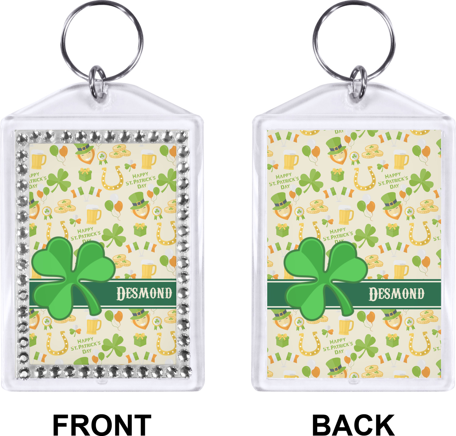 Our personalized keychains have a bold, rectangular shape, outlined by a series of shimmering rhinestones. A metal, split keyring is included with your purchase, and an additional metal hoop allows for attachment of the keychain to the split ring. This unique keychain measures at about 3.75 by 2.5 inches. We print your customized design(s) across both the back and front of this keychain.