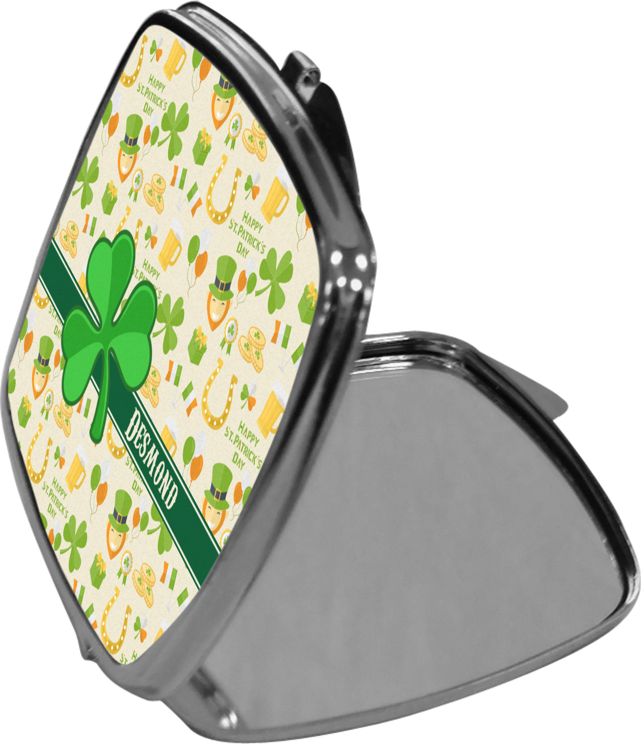 Our compact mirrors are customized with your design on one side. The other side is patterned silver tone metal. Inside, there are two mirrors.