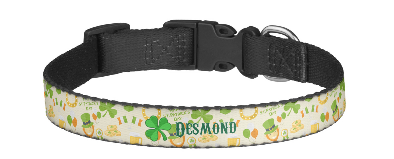 This sturdy collar, made from a durable nylon weave, will outlive your dog's episodes of excited tugging and pulling. Courtesy of its thick plastic buckle and adjuster, this collar is adjustable and accommodating of any dog. Structurally, the collar is a single piece of nylon weave that is sewn together, and features a solid metal loop where you can attach a leash or dog tag. We print and display your dog's name and pattern across the middle of the personalized dog collar.