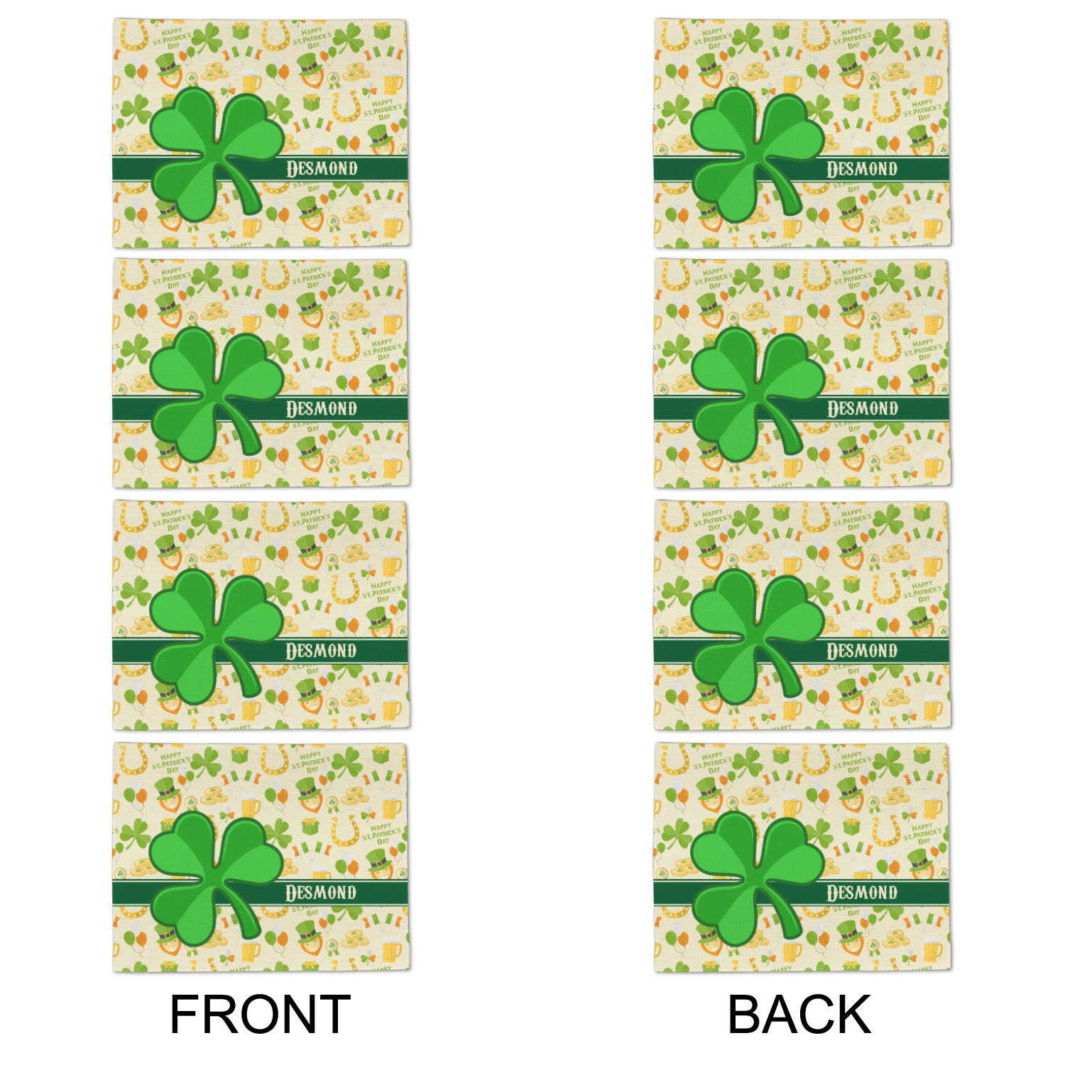 This lucky design has a lovely light cream background. There is a festive assortment of colors in all the graphics that make up the background including orange, green, and yellow. You'll find leprechauns, gold, beer, and Irish pride all in this one design! A large lucky clover is featured largely in the foreground of the design with a ribbon sitting behind it where you put your personalization.