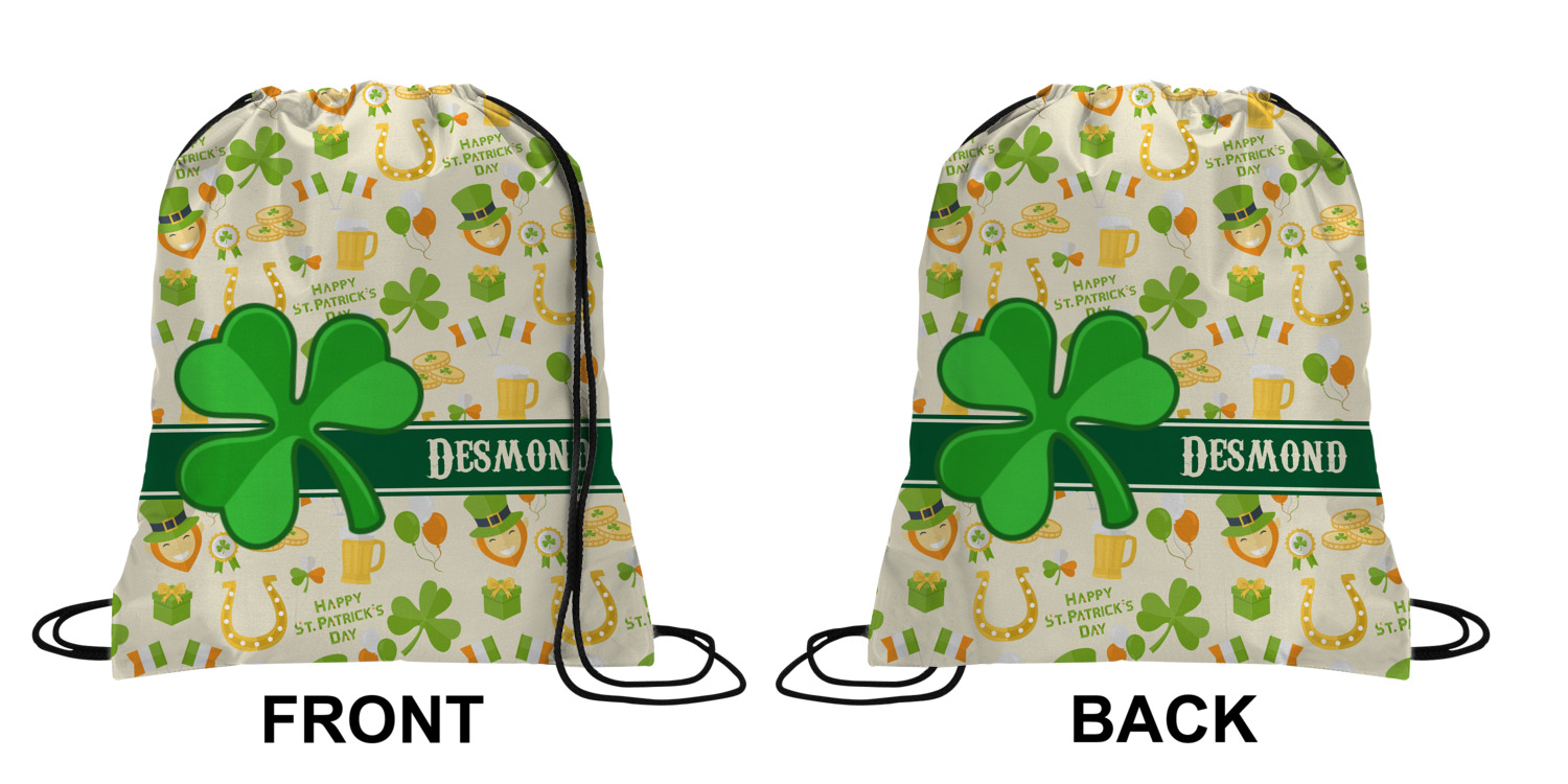 Your custom design will appear on the front and the back of the backpack. You can customize each side individually. The inside of the backpack is white and the drawstrings are black. The back pack is made of 100% polyester fabric.