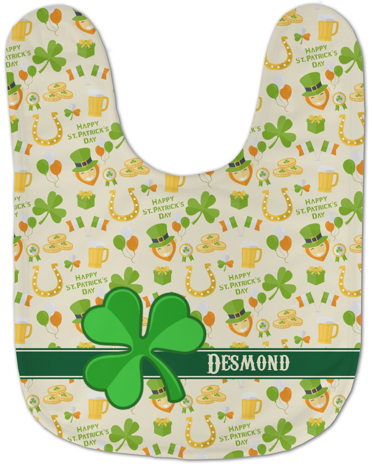 This lucky design has a lovely light cream background. There is a festive assortment of colors in all the graphics that make up the background including orange, green, and yellow. You'll find leprechauns, gold, beer, and Irish pride all in this one design! A large lucky clover is featured largely in the foreground of the design with a ribbon sitting behind it where you put your personalization.