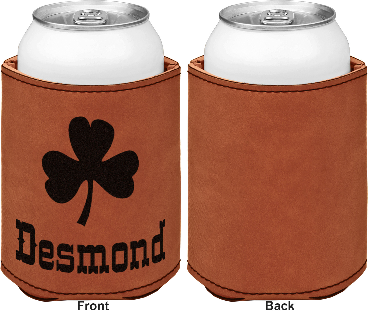 This can sleeve is made from a cognac-brown leatherette and stitched with a sturdy, black thread. A slim padding lines the inside of your can sleeve to allow for a better fit once your drink is inserted. The sleeve itself measures at 4 by 4.5 inches, allowing this custom can sleeve to accommodate most canned drinks. Your personalized design can be engraved on the front and back, or solely the front. When laser-engraved, your design appears as a black coloration which contrasts the leatherette nicely.