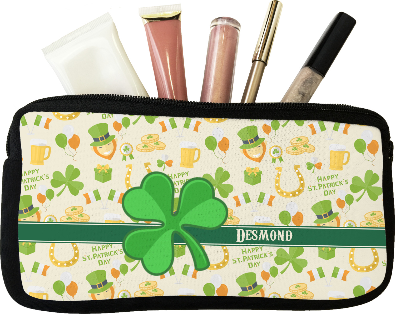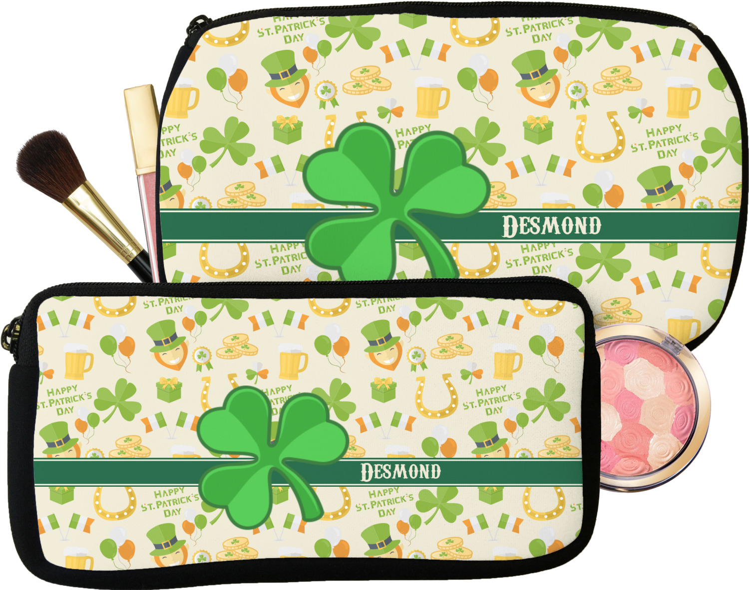Our personalized makeup bags are available in many different designs, patterns and colors - so you are sure to find one that will love. They are made of neoprene (same material as wet-suits) and thus are water resistant, so spillages in your makeup bag will not end up all over you purse. They are customized on one side and are black on the other side and the zipper is black as well.