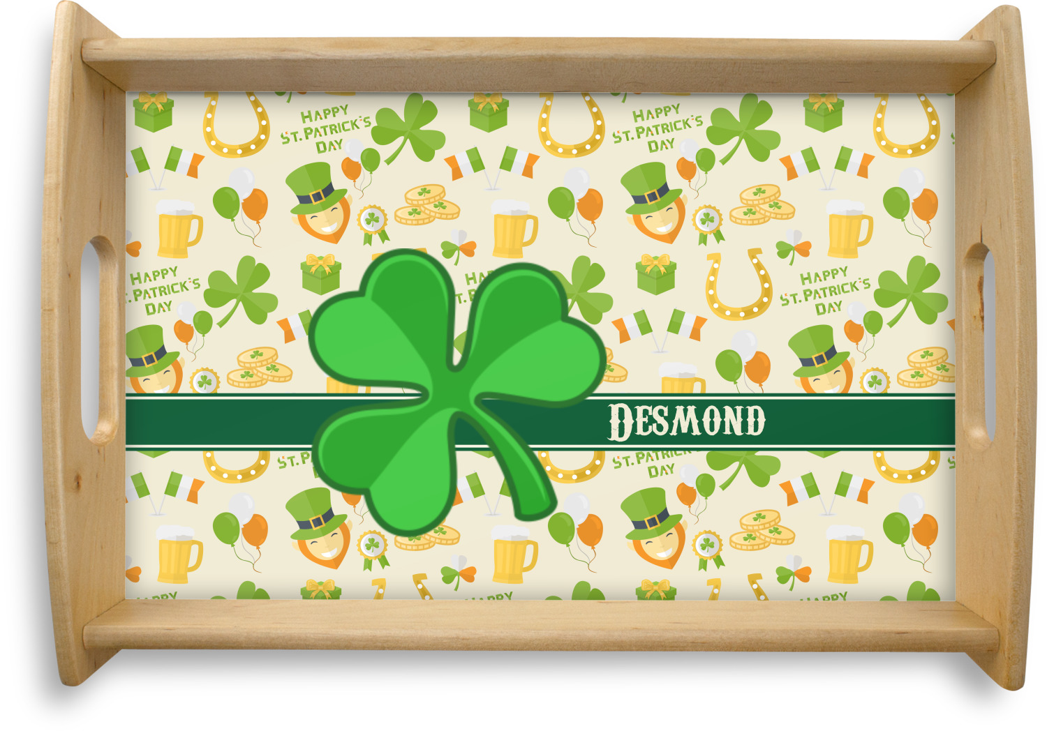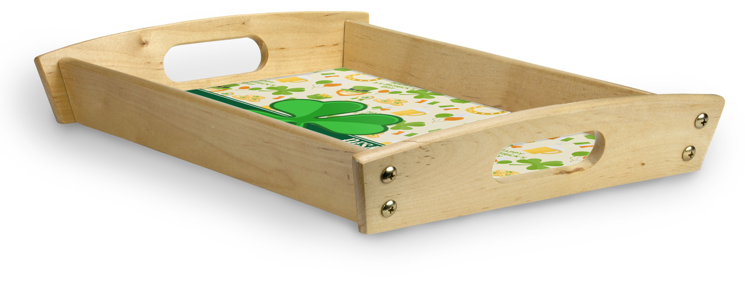 This serving tray with handles features square edges and two rounded sides, creating a very modern look. Each side is fabricated from a beautifully cut, natural wood. The bottom of the interior of the tray displays your customized design in bright, vibrant color. The tray is sold in both a black color and a natural wood look. Each variation of the wood serving tray has two sizes: Small, which is 14" x 10" x 2.25", and Large, which is 19.5" x 13.5" x 2.75".