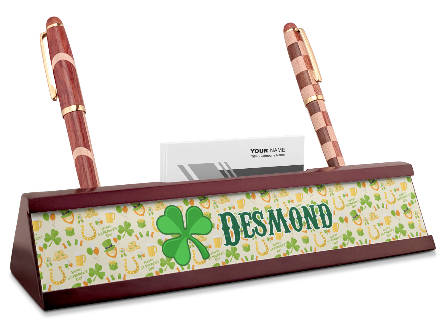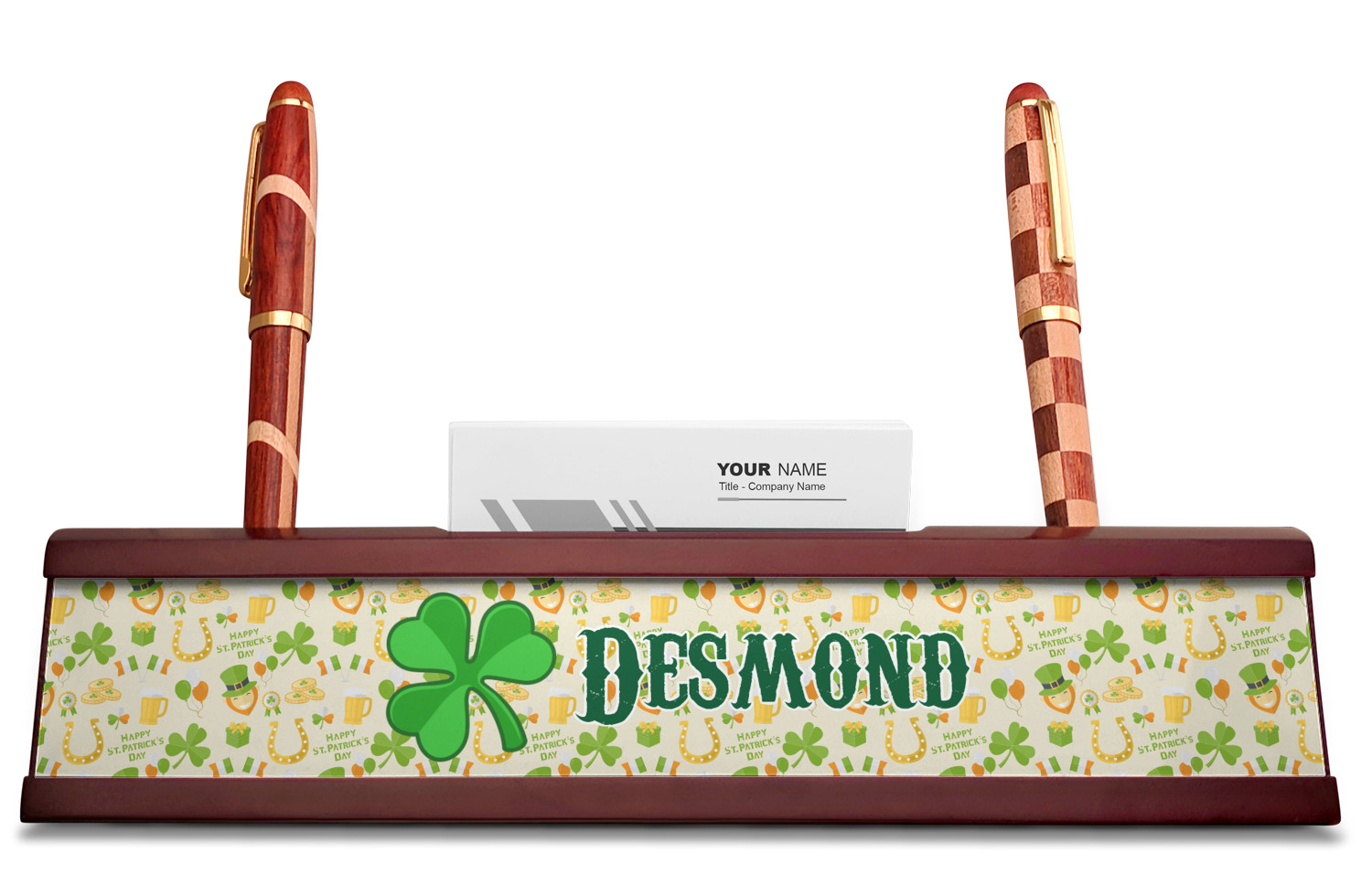 Your desk name plates are crafted from a high-quality, dark-cherry mahogany. At approximately 9.5 by 1.875 by 2.5 inches, this name plaque will fit perfectly, front and center, on your desk. Your customization spans across the entire face of the nameplate. Behind the nameplate lies a skinny slot that can fit approximately 15, traditionally-sized, business cards. You can also store your writing utensils on either side of this custom desk name plate.