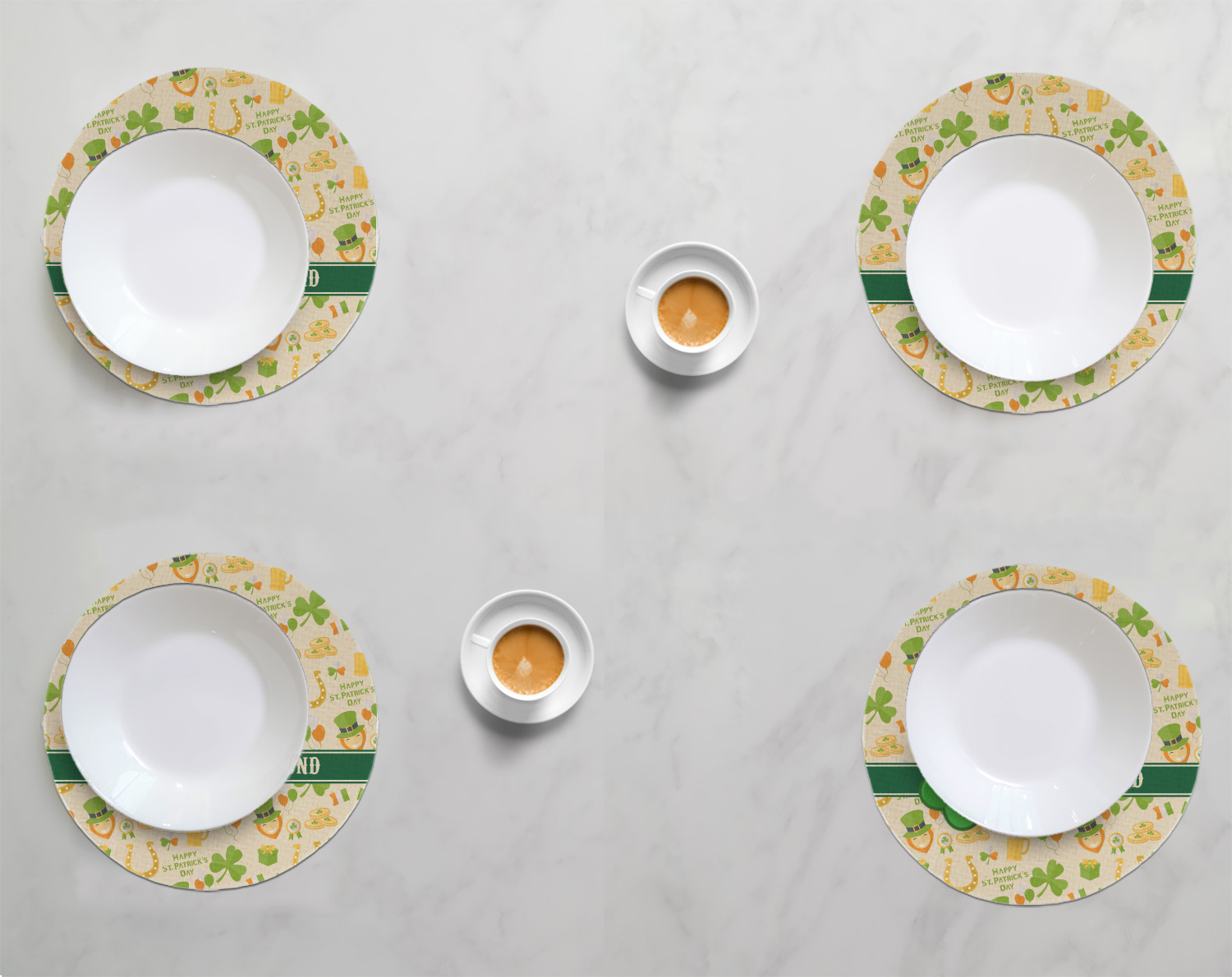 This lucky design has a lovely light cream background. There is a festive assortment of colors in all the graphics that make up the background including orange, green, and yellow. You'll find leprechauns, gold, beer, and Irish pride all in this one design! A large lucky clover is featured largely in the foreground of the design with a ribbon sitting behind it where you put your personalization.
